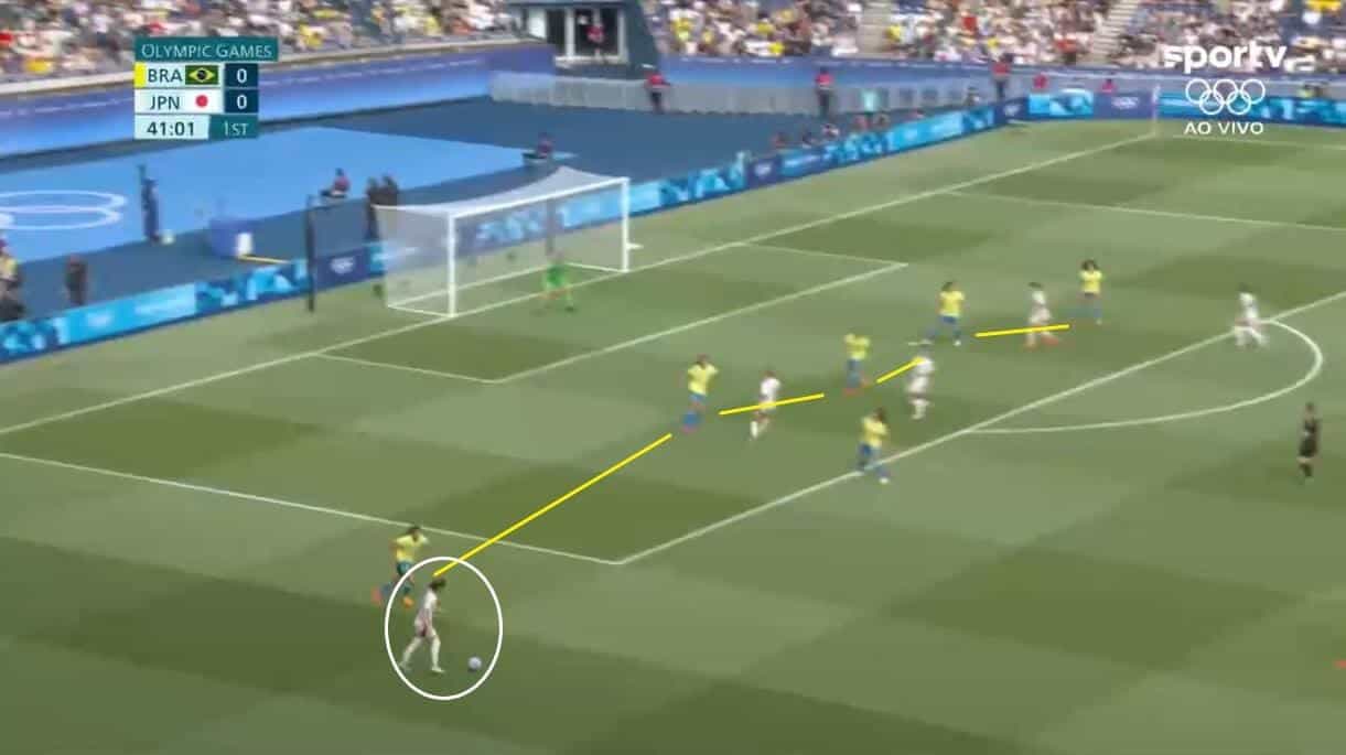 If Yasmim had stayed in her usual position, Japan would have likely been able to cross the ball into the middle and have had a chance to shoot at goal here.