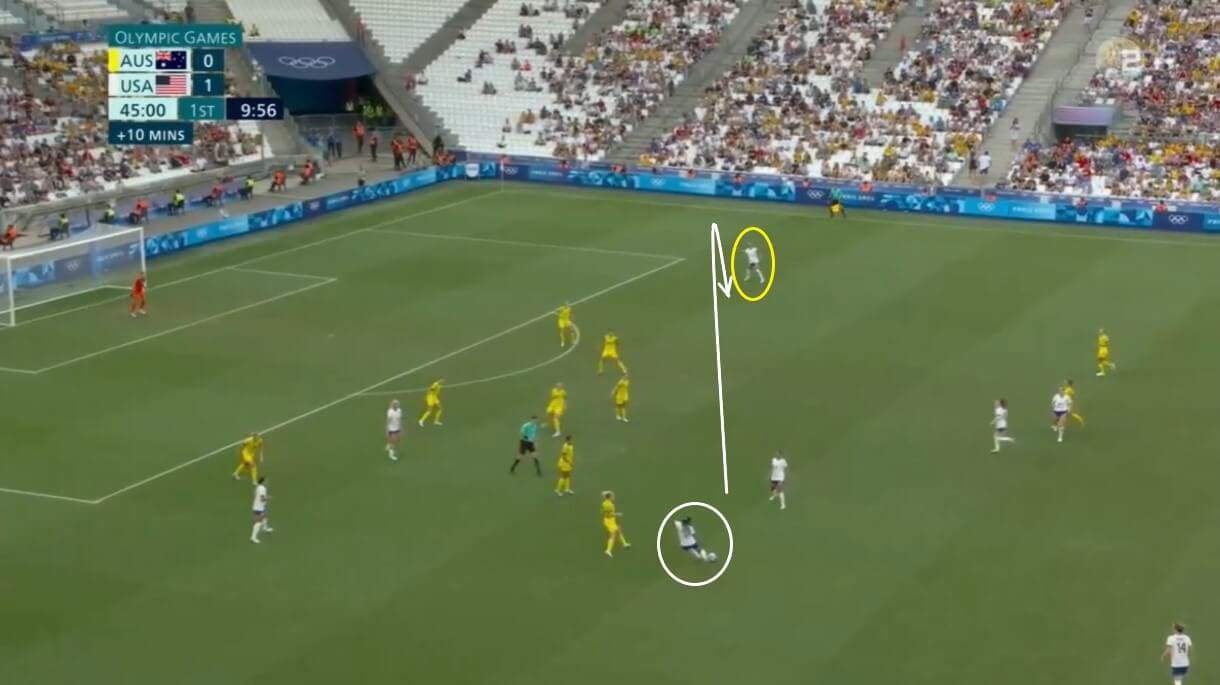 Against Australia and Germany, that proved to be especially effective in allowing them to create chances in dangerous positions, with Rose Lavelle bringing the ball across the pitch here and Crystal Dunn then sending it back towards Trinity Rodman, and it was not long before Australia began to unravel and to give the USA an opportunity to attack between their lines.