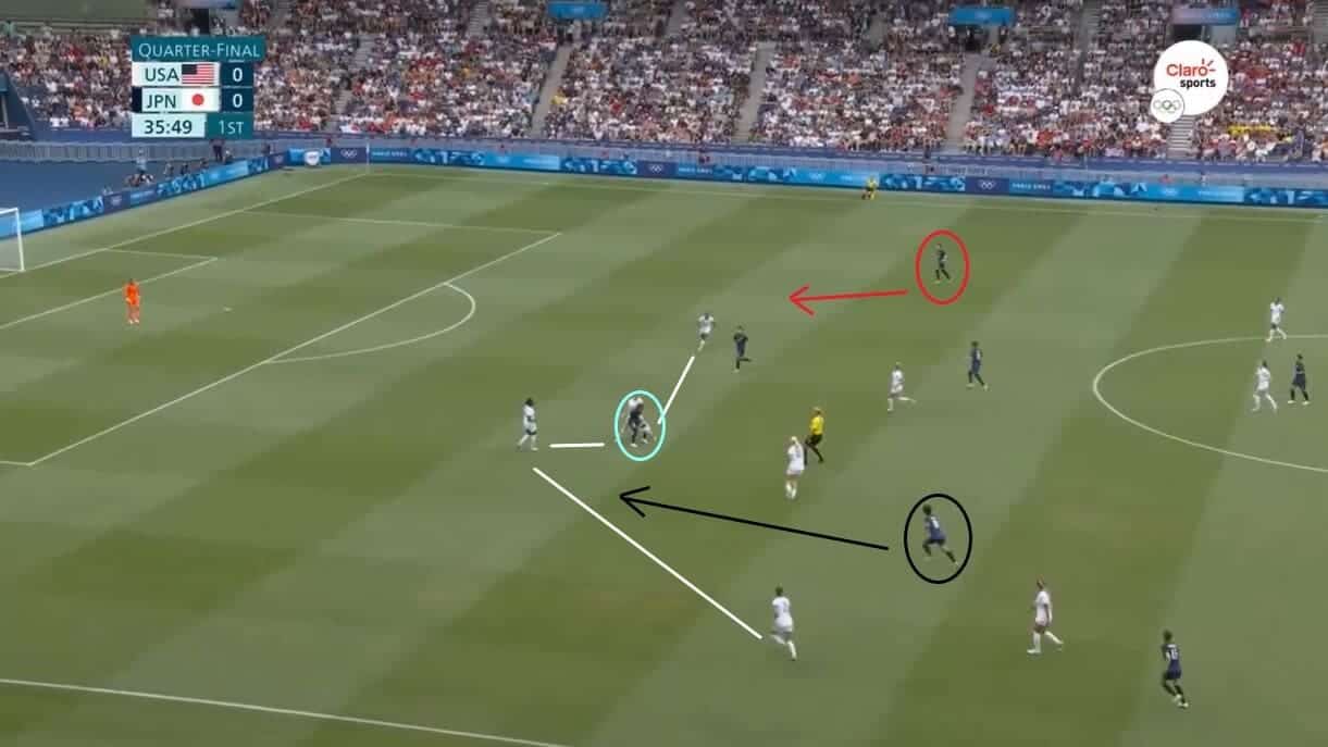 It looks initially as though the USA can manage the situation due to Yui Hasegawa having her back to goal when the ball arrives at her feet, but what the USA have failed to notice is the run made by new Brighton and Hove Albion striker Kiko Seike between Fox and Horan.