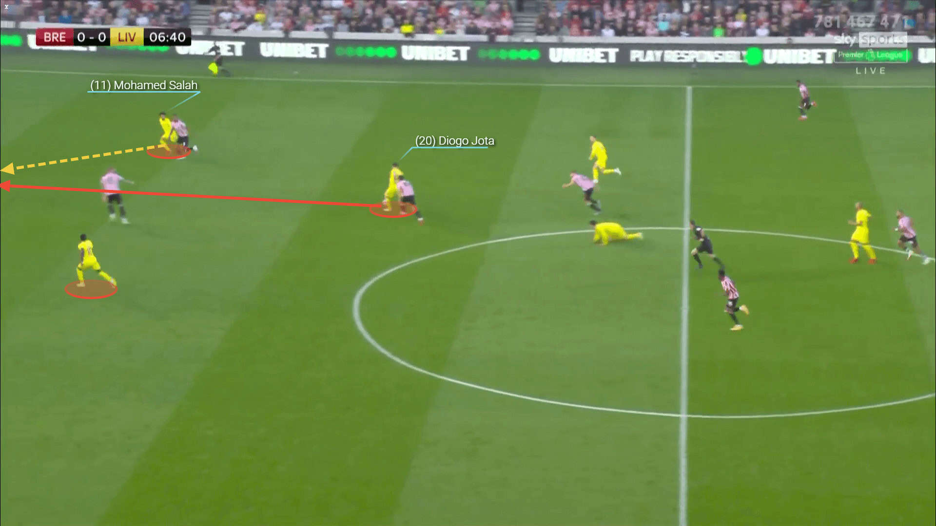 As said, Jota’s movement shouldn’t be underestimated, and the Arsenal midfielders need to constantly be aware of the risk he possesses. He drops back to pick up the ball but also frequently moves into the box which is extremely threatening due to his through ball ability and strong finishing.