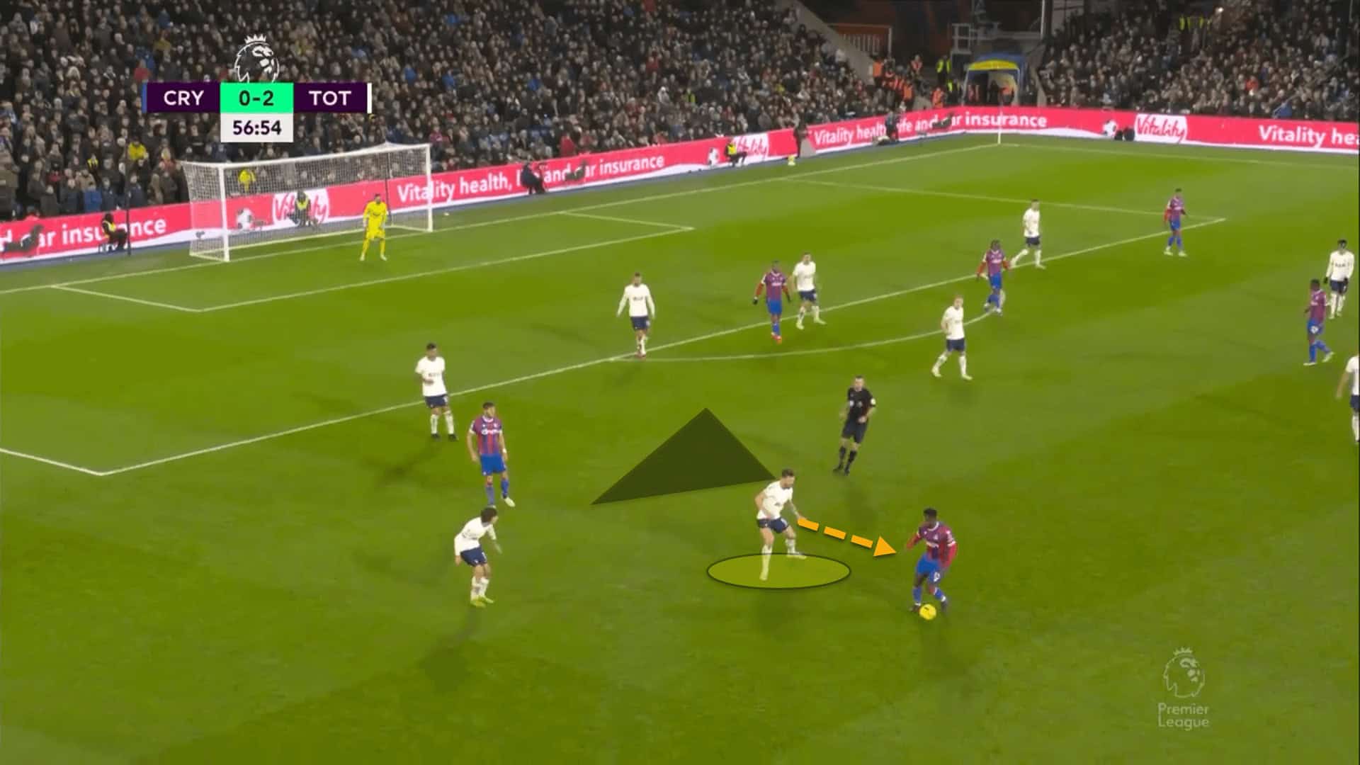 Once more, the triangle between the right-back, right winger and the right central midfielder is evident, pinning Spurs’ defenders deeper on this side.