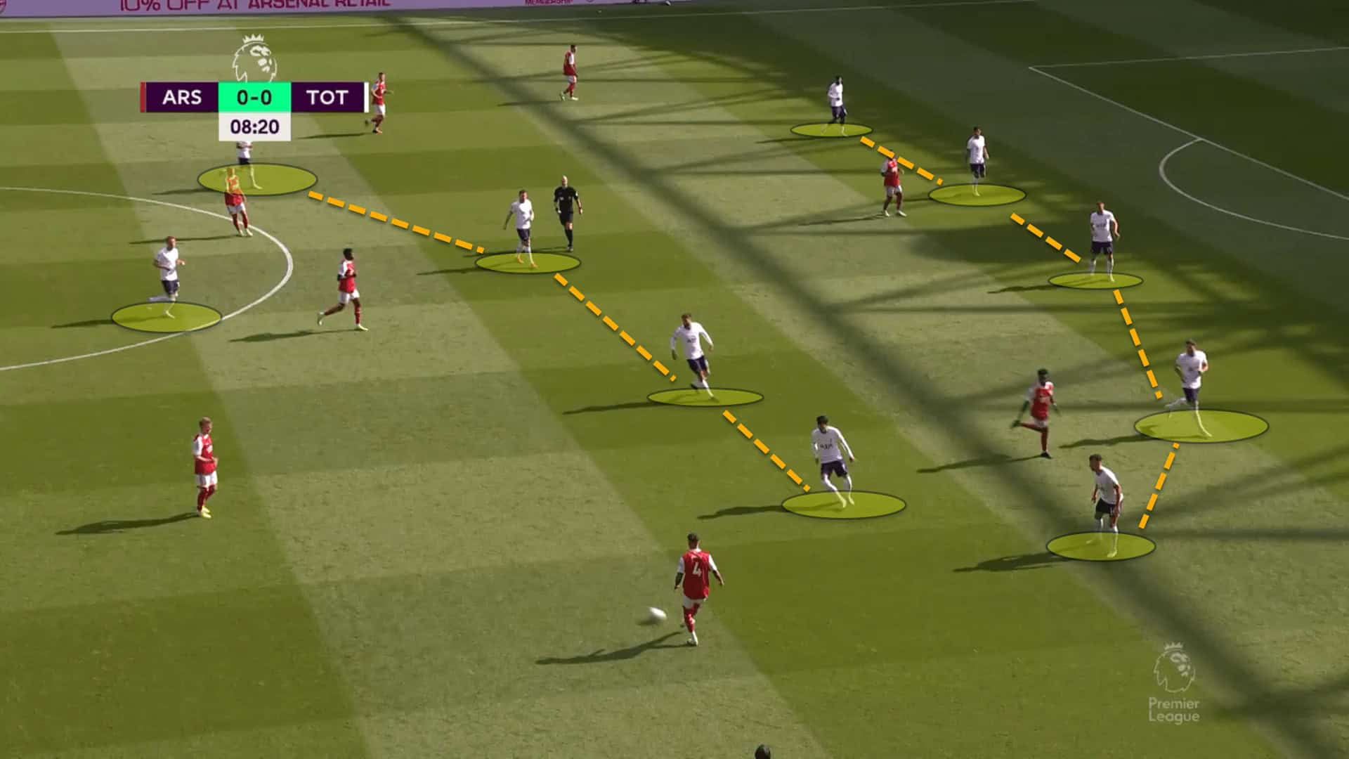 If opponents can bypass the first counterpressing wave and drift past Partey when the Ghanaian steps up to help out, they can attack the wide areas with runners. Spurs did this really well at times in the reverse fixture.