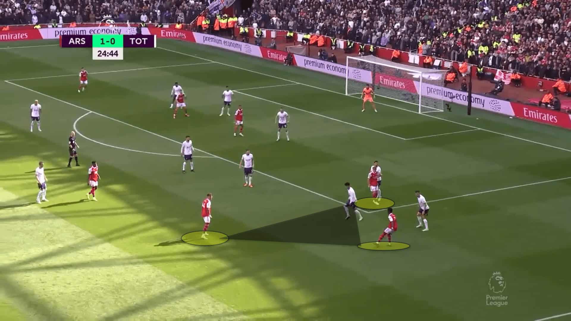 Here, White was holding the width on the right, while Saka pushed inside into the halfspace. Meanwhile, Ødegaard was operating as the nadir of the triangle.