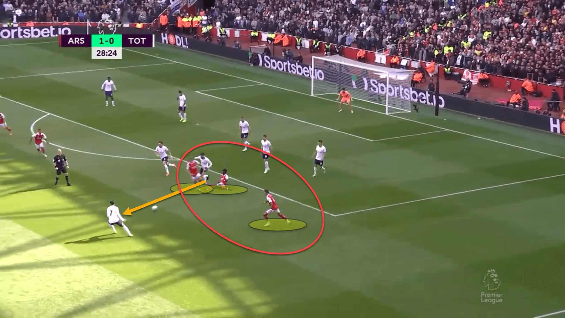 Saka and White had pinned back Spurs’ defenders on this side which meant that, when the Norwegian midfielder received the ball, he would have an extra second or two to pick a pass to the back-post where the visitors were exposed.