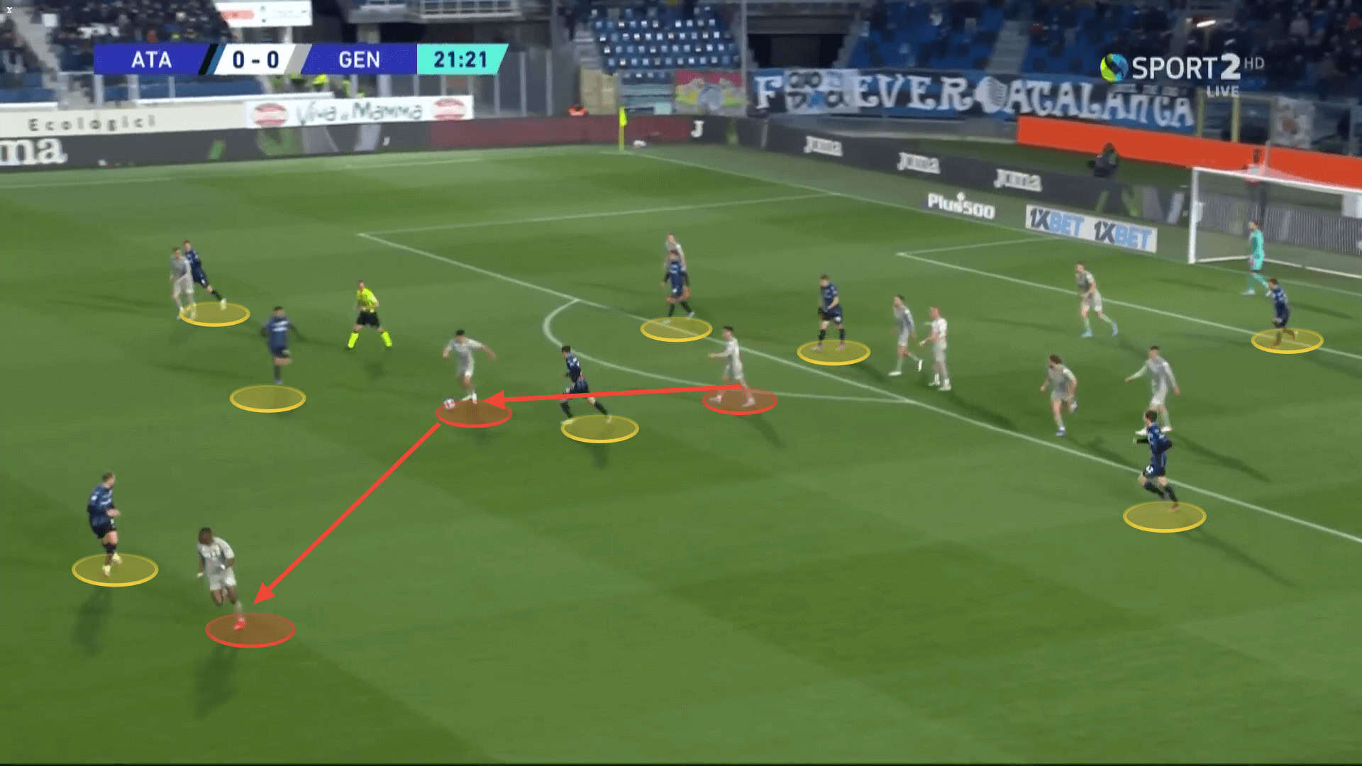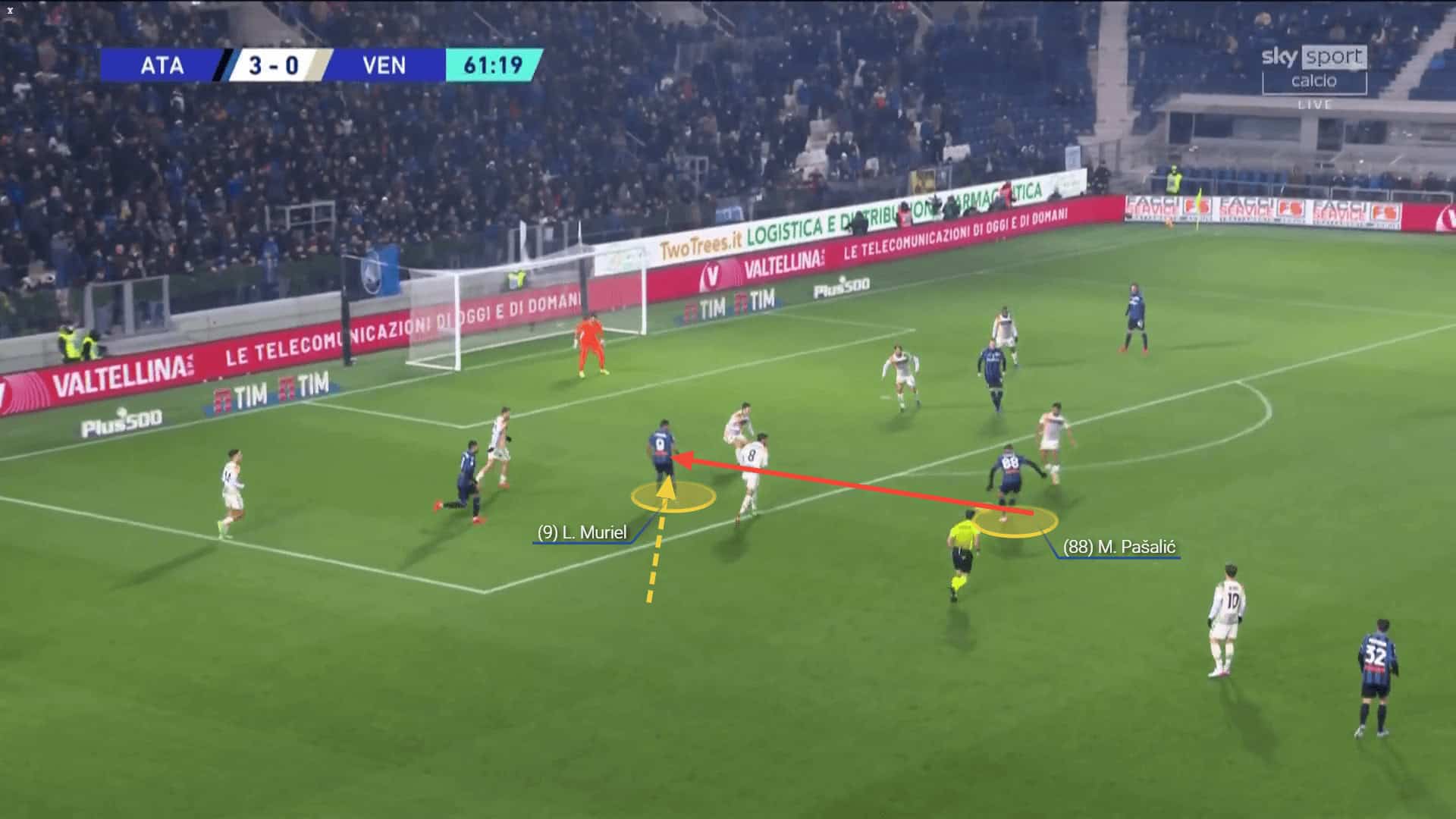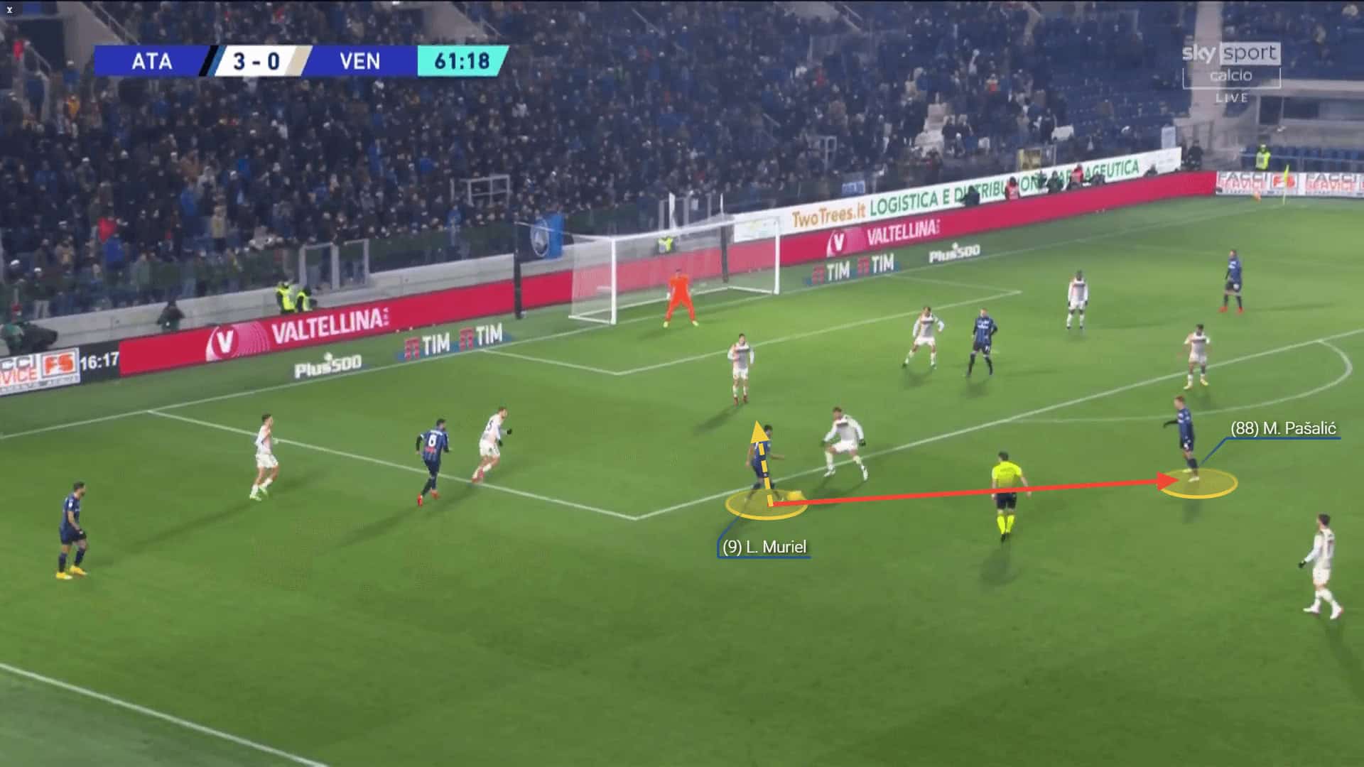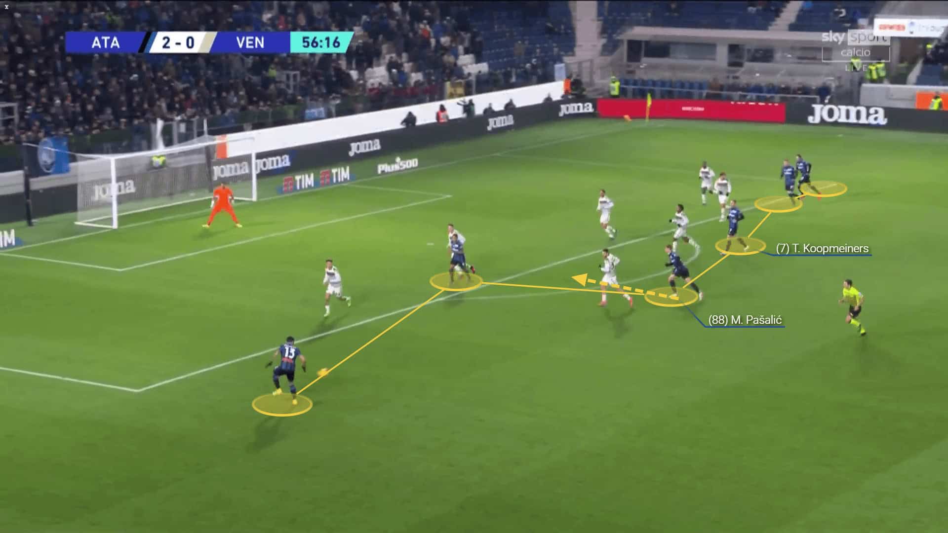 His positional awareness and link-up-play ability allow him to stroll between the oppositions’ lines and eighter provide a quality passing option or exploit spaces and be a direct threat. Similarly to Gosens, the runs to the box that Pašalić makes often catch Atalanta’s opponents off-guard and increase their chances in attack as they exploit spaces more efficiently.