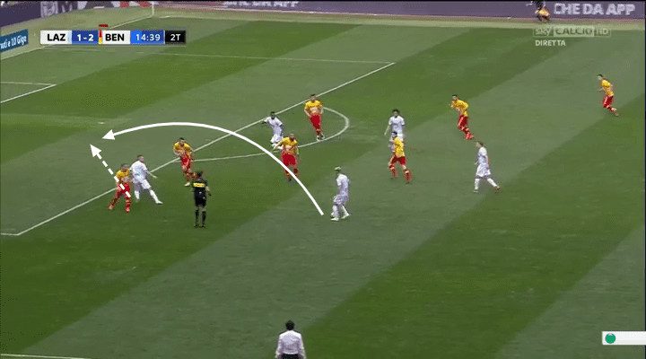 The scene above is a good example of how the midfielders join Lazio’s attackers through their deep runs. Here, Alberto threads a pass through an entire team to find a midfielder behind the opponent’s defensive line. It’s not just the midfielders making these runs though, Ciro Immobile is fantastic with his deep runs and the wing-backs always provide a wide option to progress the play.