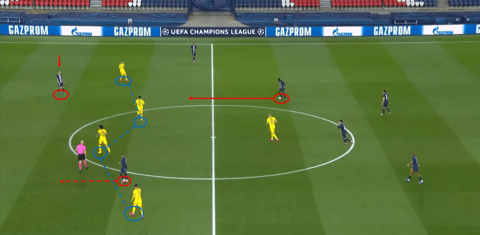Above we can see Di María positioned beyond the Dortmund midfield, calling for the ball. Gueye has the time and space to pick him out with a direct pass. Down the left flank, Neymar is keeping an eye on the play and is ready to make a run towards the final-third to provide numerical dominance in the final-third.