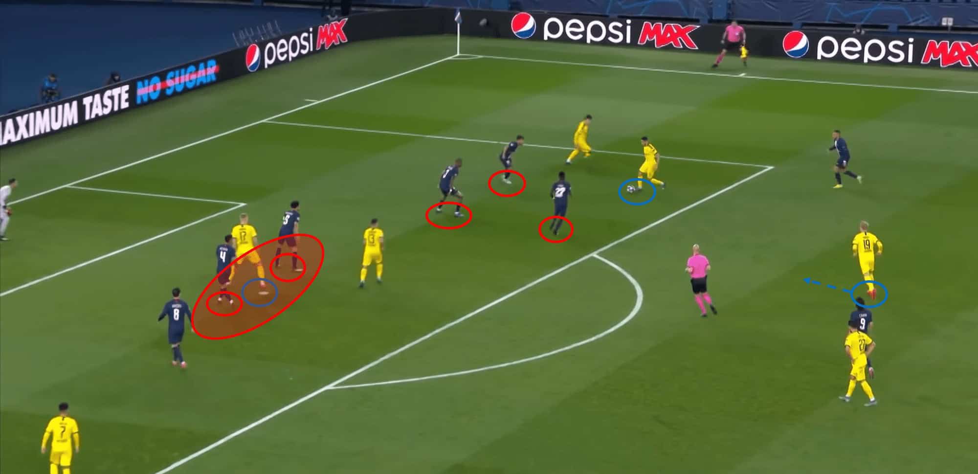 Overhead in the analysis, we can see how Håland was contained by PSG, and this is something they could execute on Zapata. By blocking off a possible sprint with Kehrer behind him, and Marquinhos in front to stop any possible aerial danger.