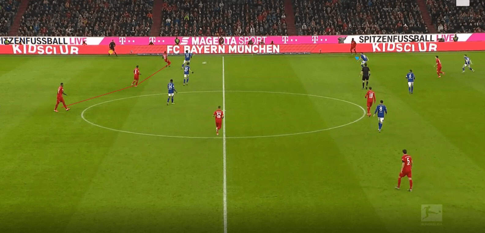 The central midfielders offer the most flexibility in terms of build-up, and it is their positioning which helps Bayern to progress the ball. One central midfielder will often drop into the back three to facilitate build-up, as if they drop into the centre of the back three as they do here, it allows the centre backs to move wider. This stretches the first line of the press, which in turn engages the second line of the press, which here forces Schalke to move from a 4-4-2 to a 4-3-3. The additional width of the back three also allows for the full-backs to push higher and wider, which then increases access to the half-space.