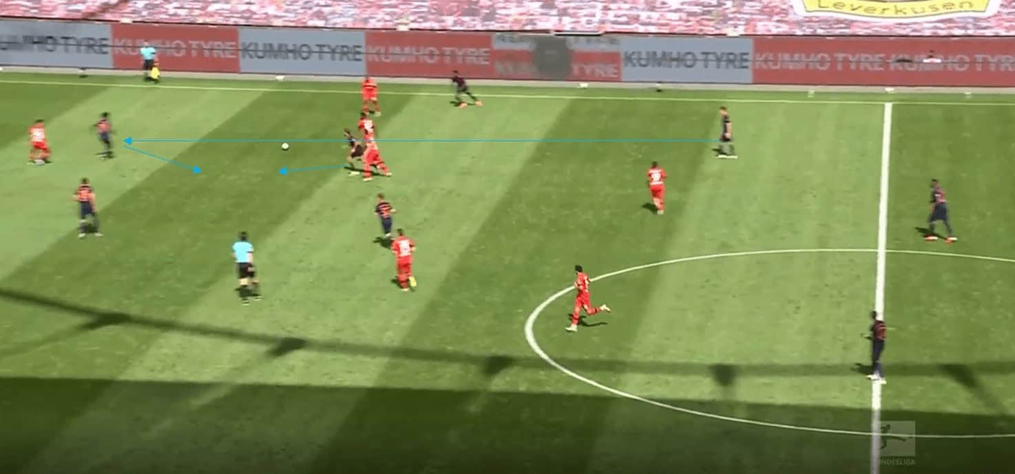 Bayer Leverkusen were also able to create the same overload at times, with here Leon Goretzka having two players either side of him. If Goretzka commits higher, he concedes the deeper space, while if he commits deeper he concedes the space in front. The other central midfielder is occupied at all times to prevent them from nullifying the overload, and so one player is always able to receive if done correctly.