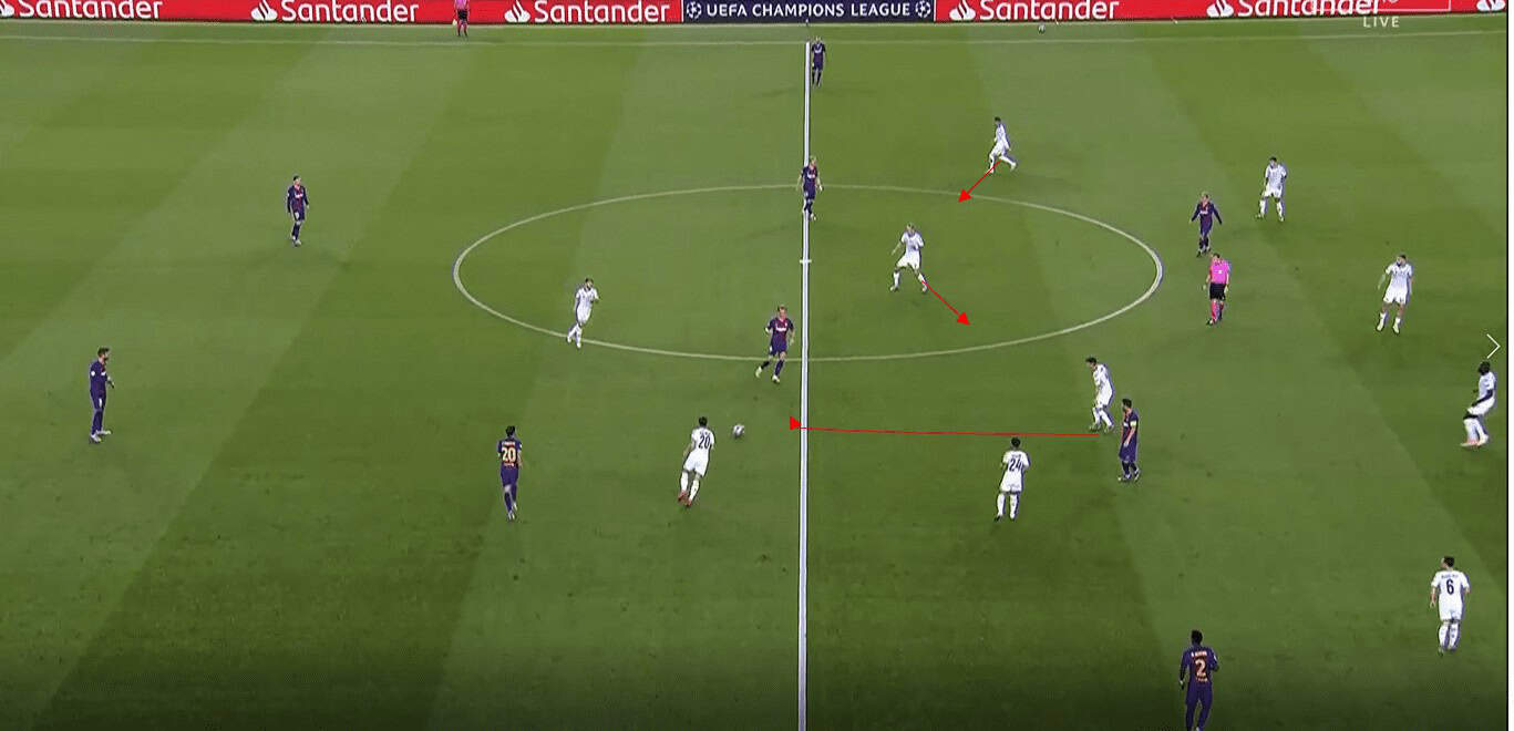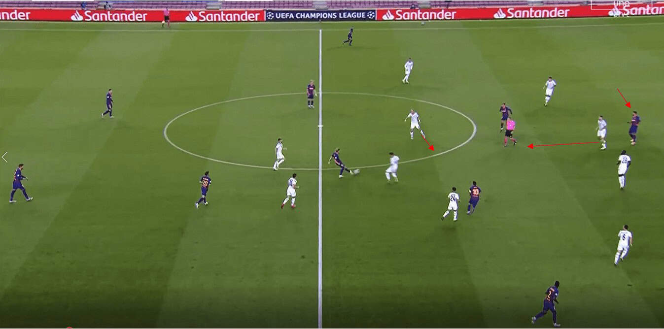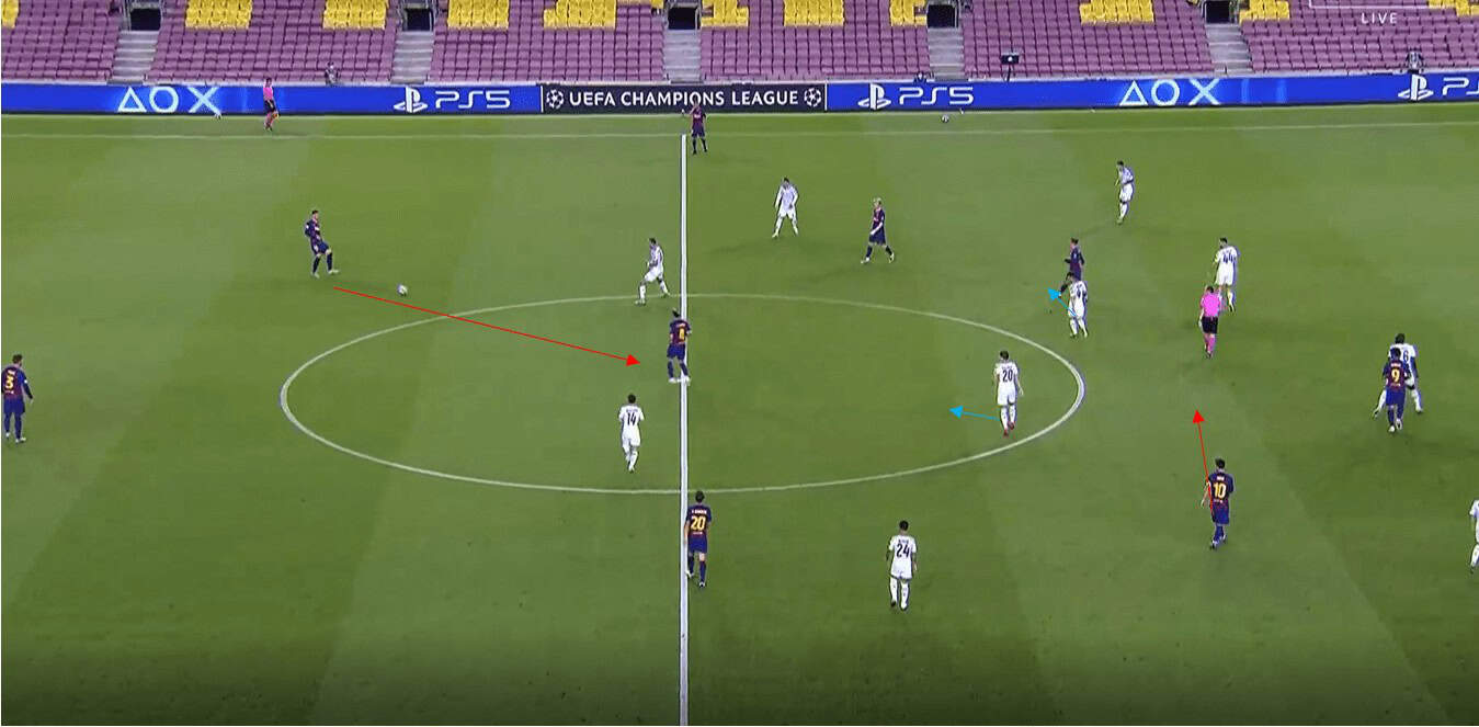 Below we can see an example of how Messi could be used as a decoy. Messi drops in front of the central midfielder in the half-space and offers himself for a pass. The Barcelona central midfielder also offers himself, creating a 2v1 decisional problem for the Bayern midfielder. With Messi visible and directly in front, the Bayern player may be drawn towards limiting Messi, and so the ball can be played to the far player, and then a diagonal pass can be made through to the winger.