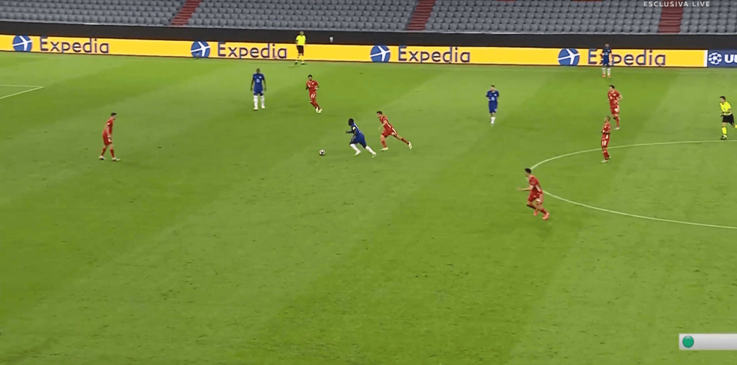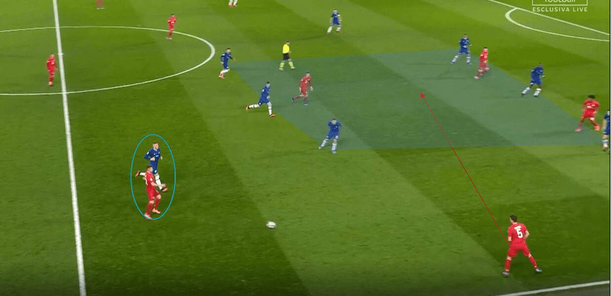 Central midfielders will also drop in as a wide centre back in the deep half-space, which has the same effect in allowing the full-back to push higher. Here Thomas Müller starts from a deeper position just behind Chelsea’s midfield, before then timing his run to arrive into space with good body orientation. Lewandowski will usually maintain the height in the side, and so will stay on the last defender to pin the defence back.
