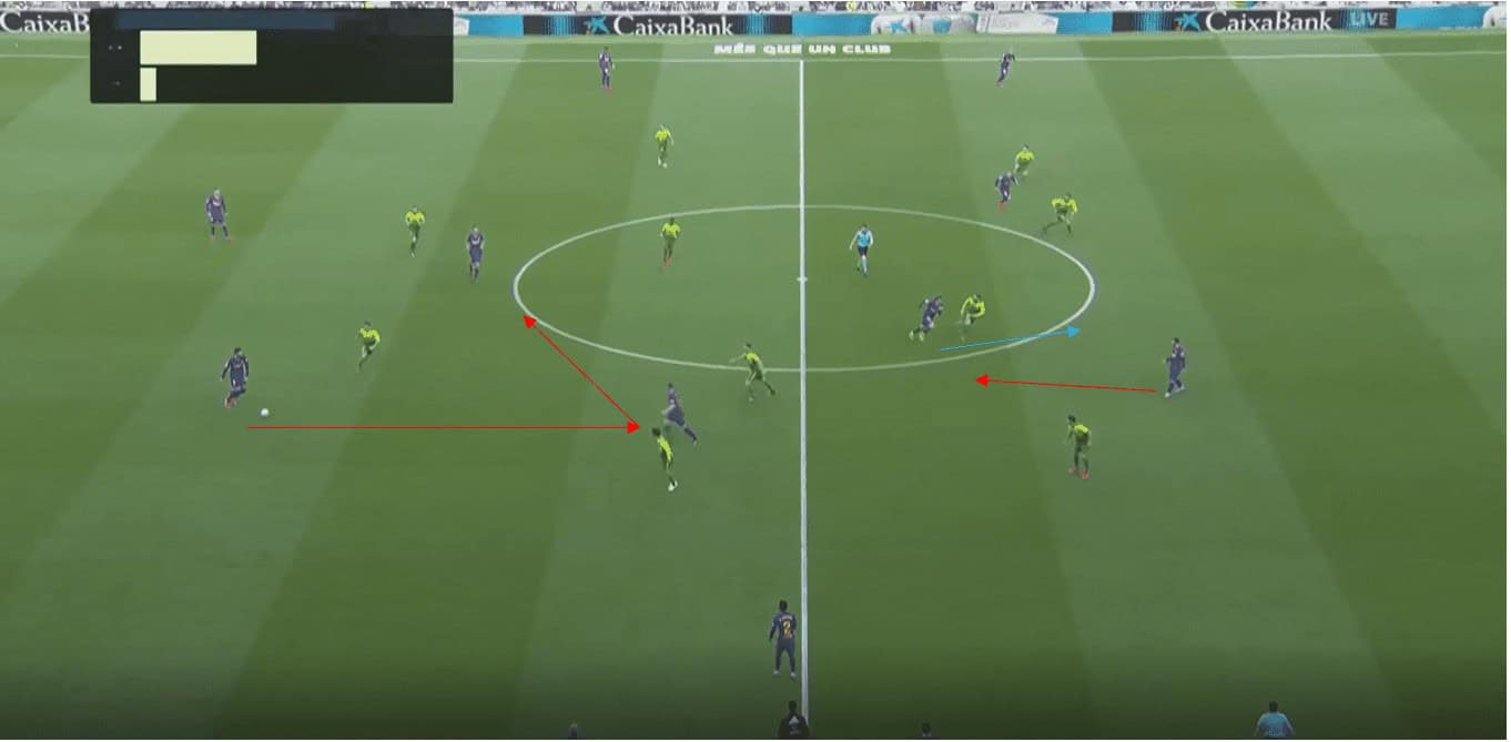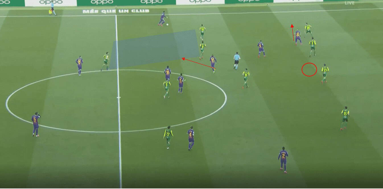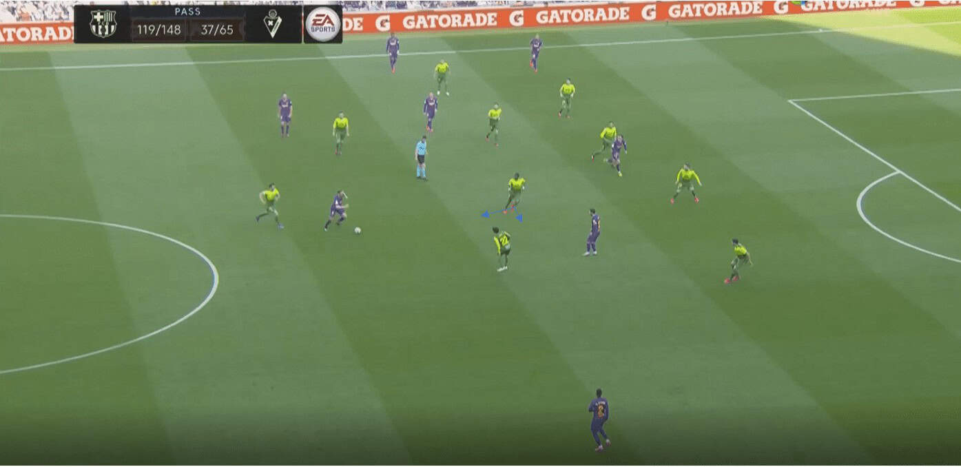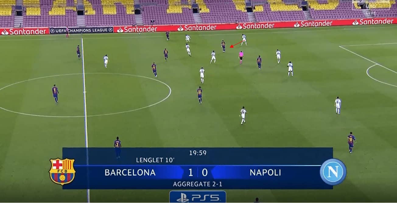 We see here the half-space is occupied while the full-back is wide and has the ball. The problem with this structure is fairly simple, in that no real width is provided to help the half-space, as the Napoli full-back is free to press the half-space easily. A key idea which Barcelona need to use is to pin the full-backs, as this will give space for the likes of Messi to operate in the half-space without being pressed easily.