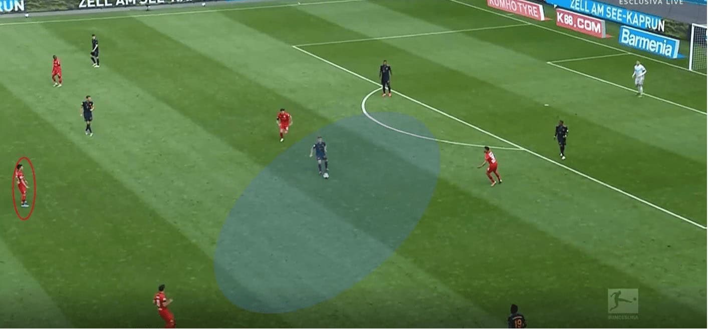 We can see an example of this in game against Bayer Leverkusen, with Joshua Kimmich dropped deeper to escape the press of Charles Aránguiz, who won’t press that high to avoid conceding so much space behind him.