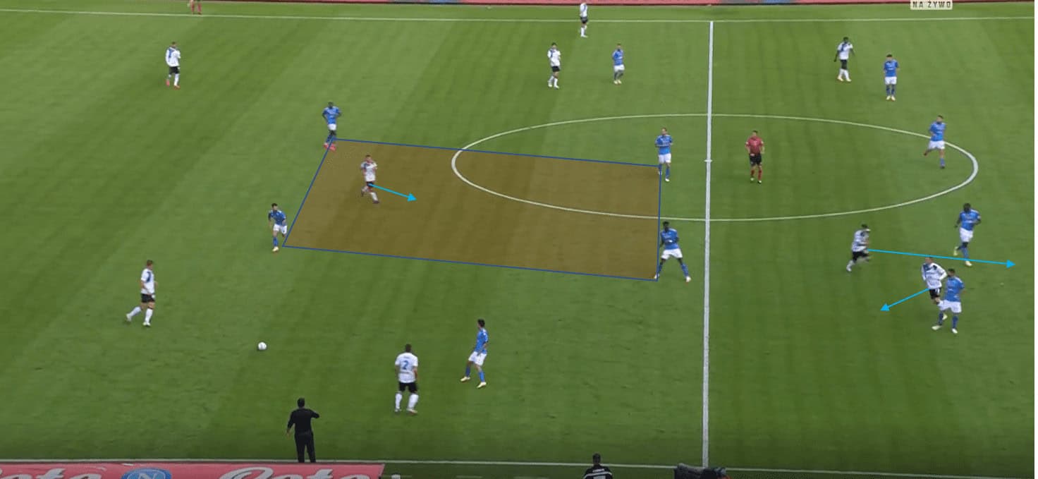 We can see an example of their ideal pressing structure below, with the wing-back applying pressure on the ball while the central options are marked by the strikers and central midfielders. Again the opposition drop into a double pivot, and so Atalanta follow them with two high pressing central midfielders. The deepest midfielder therefore protects the back four, and so can monitor any players dropping to receive. As a result of this three man midfield, it is difficult to overload Atalanta centrally without the use of either a diamond or a forward dropping to receive, both of which reduce the attacking teams options highest up the field.