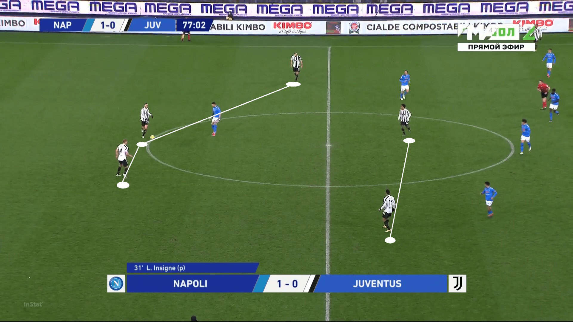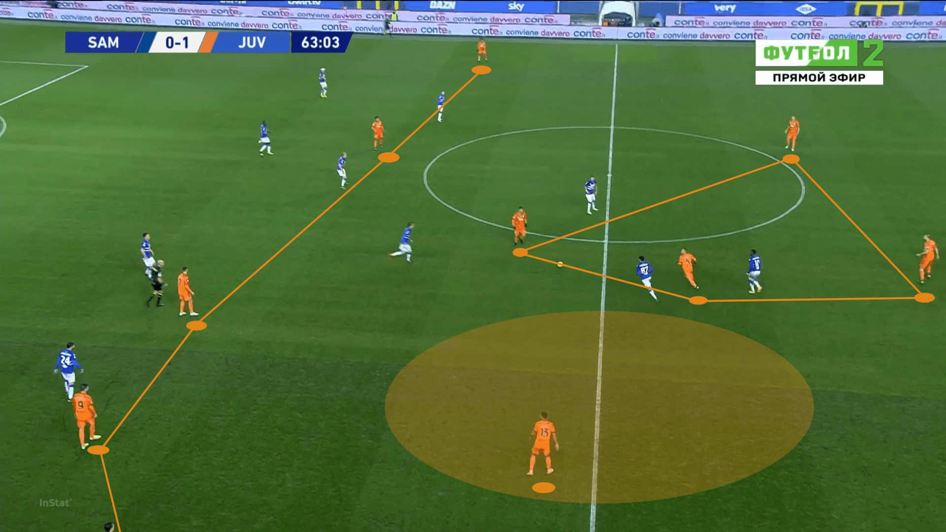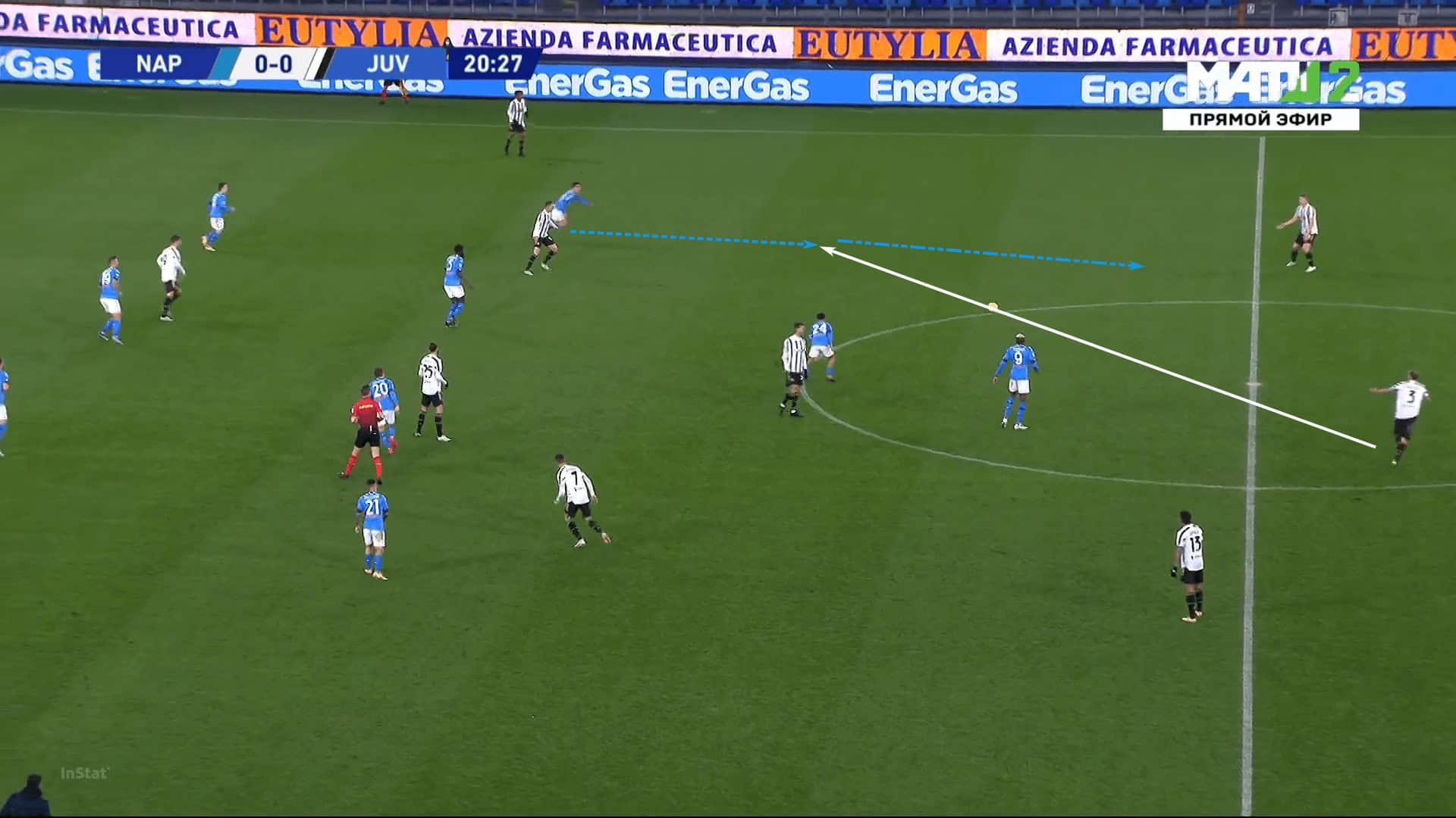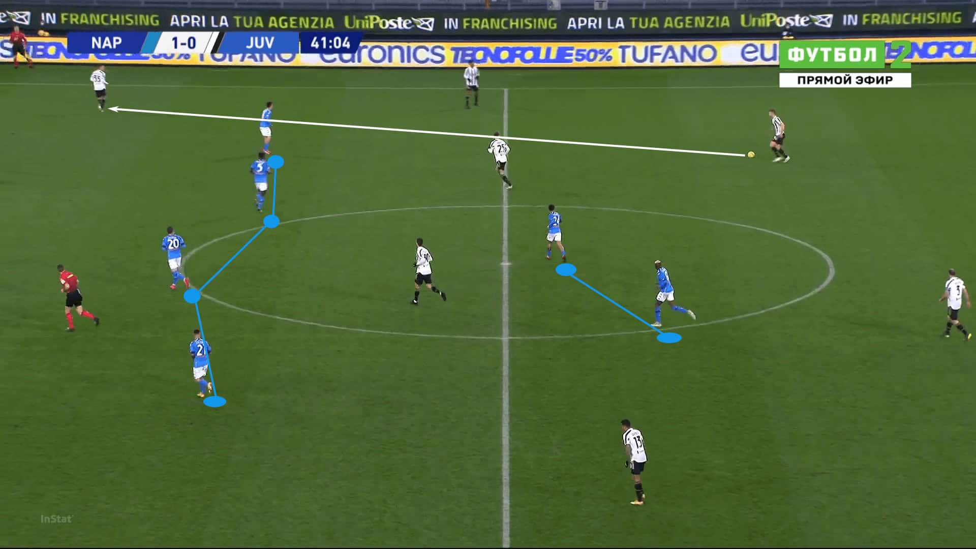 As mentioned, Juventus’ backline is loaded with talent, and that includes her ability to brake lines through their passing. De Ligt and Bonucci will occasionally look to play behind the Porto backline, stretching them with passes into space, but we’re just as likely to see the centrebacks play around the defence and hit the wide targets, much like in this image against Napoli.