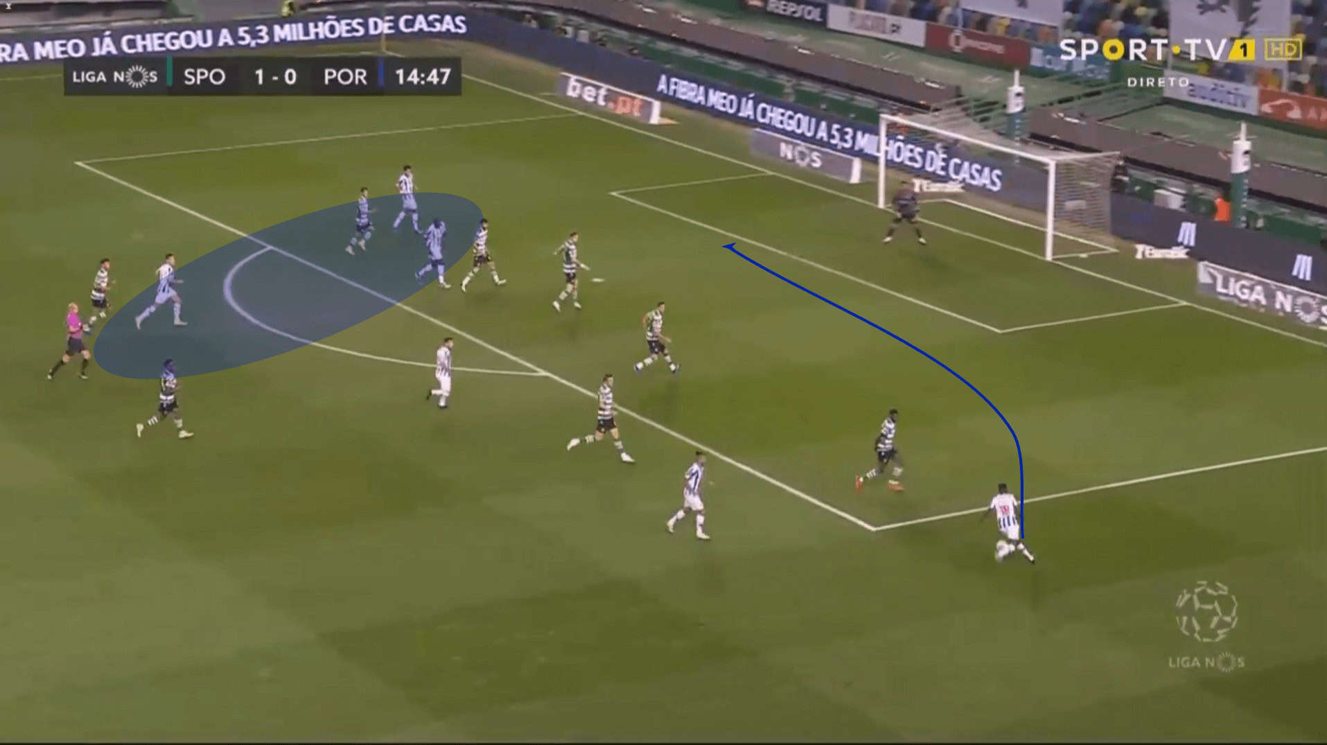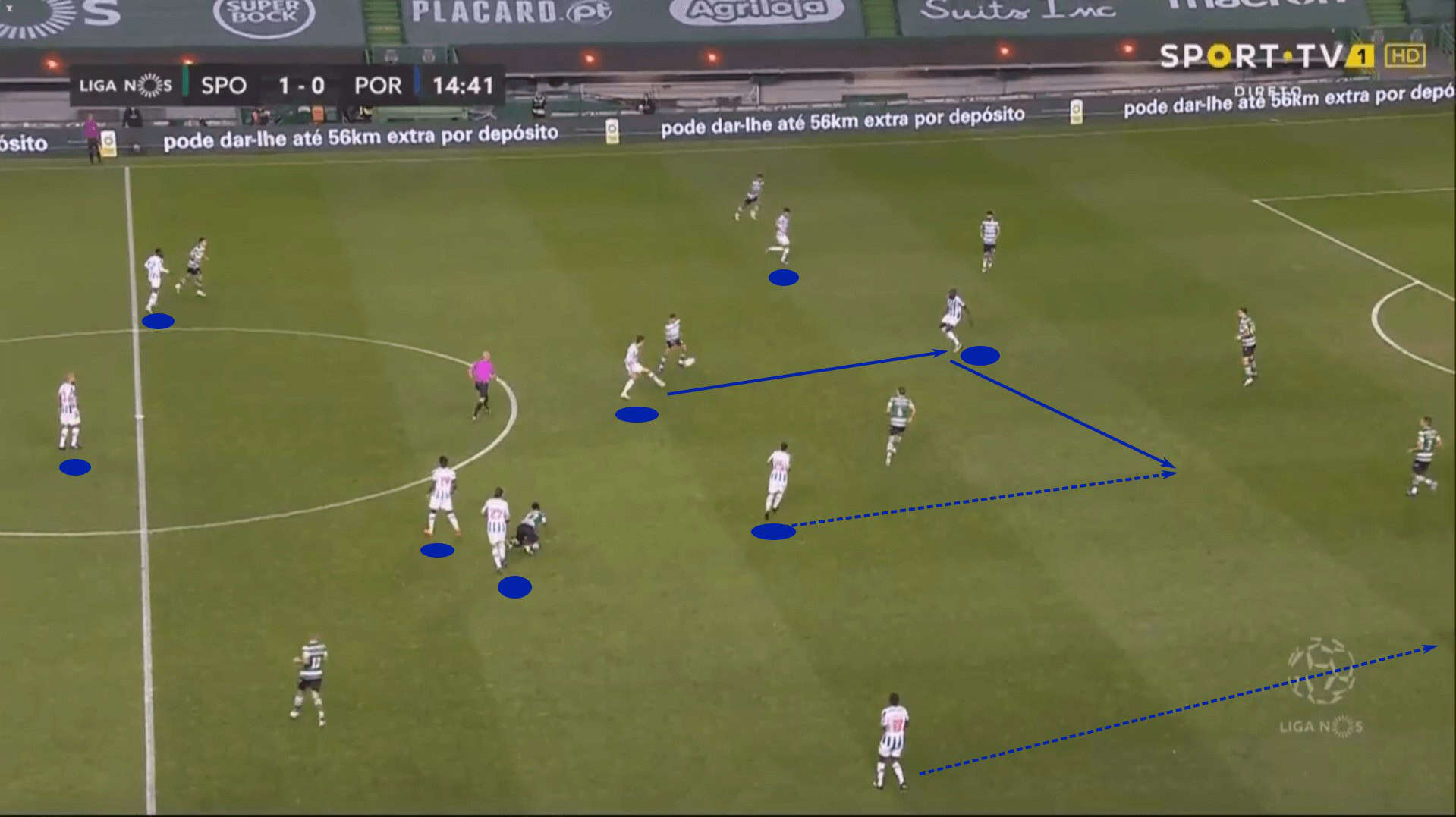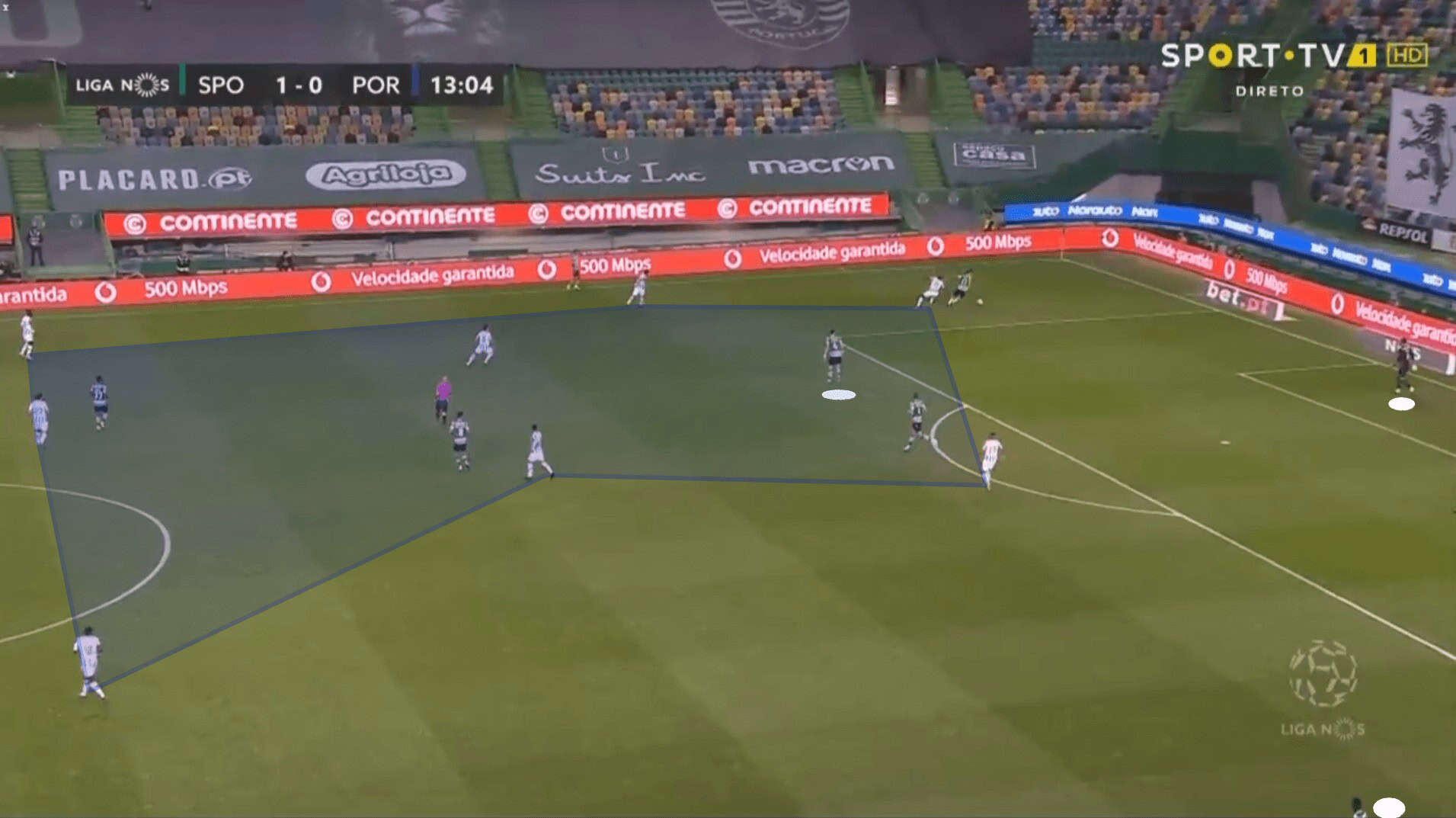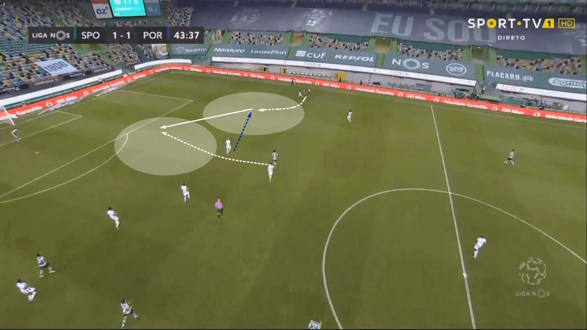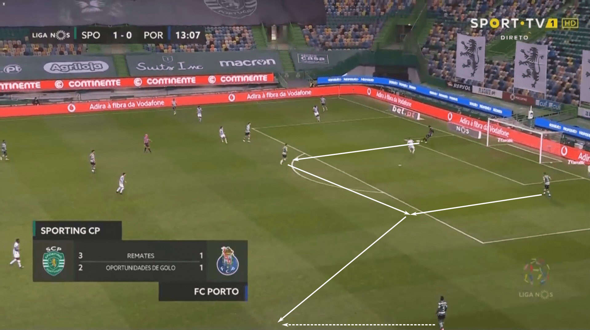 The simple pass of the goalkeeper allowed Sporting to play into João Palhinha before releasing the third runner, Sebastián Coates. The former Liverpool man then released the teenage sensation, Nuno Mendes, into the left-wing, breaking the Porto press.