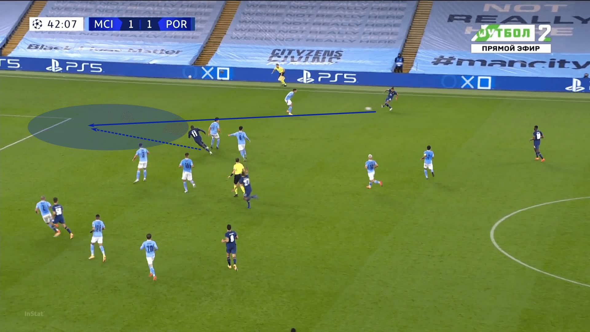 Porto looked to do the same against Manchester City. During their away loss, the aggressive runs of Marega behind the backline and into the half spaces was a real standout. He did very well to play off of the back shoulder of his defender, then burst behind the backline at the right time.