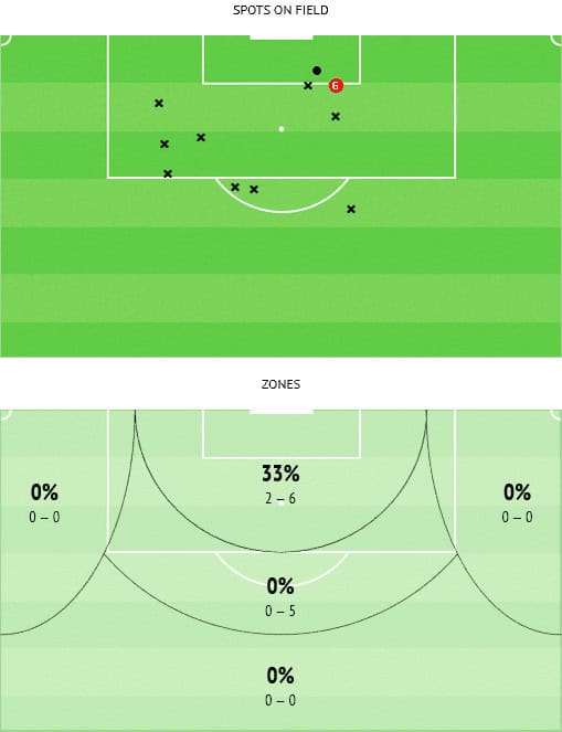 Another key aspect to consider when dealing with Bayern Munich is the frequency of shots and shooting positions. Chelsea were only able to shoot twice on target in the first leg, including Leupolz’s goal, and the rest of shots were either blocked or went off target, and this explains highlights how Chelsea were not dangerous in this match. But in the second leg, the Blues will need to creating shooting opportunities and aim for shooting from distance especially when Bayern defend well. Moreover, and as you can see in the image below, Chelsea did not shoot from the wings at all as they did not rely on their wingers heavily in that match.