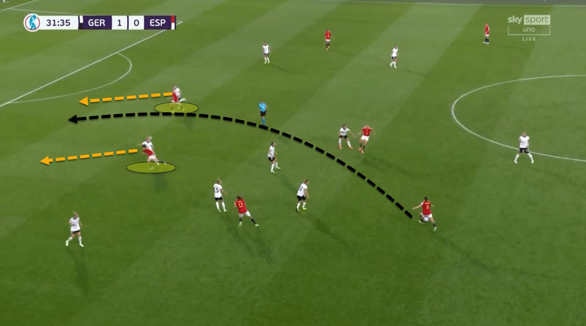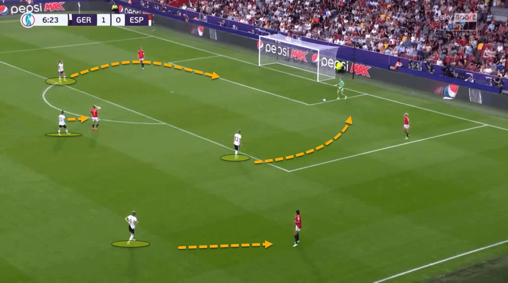 Here, the German centre-backs Marina Hegering and Kathrin Hendrich have excellent body orientation here to track their runners. By keeping a side stance, it allows the central defenders to be ready to step up when needed but also drop back in case of a ball in behind.