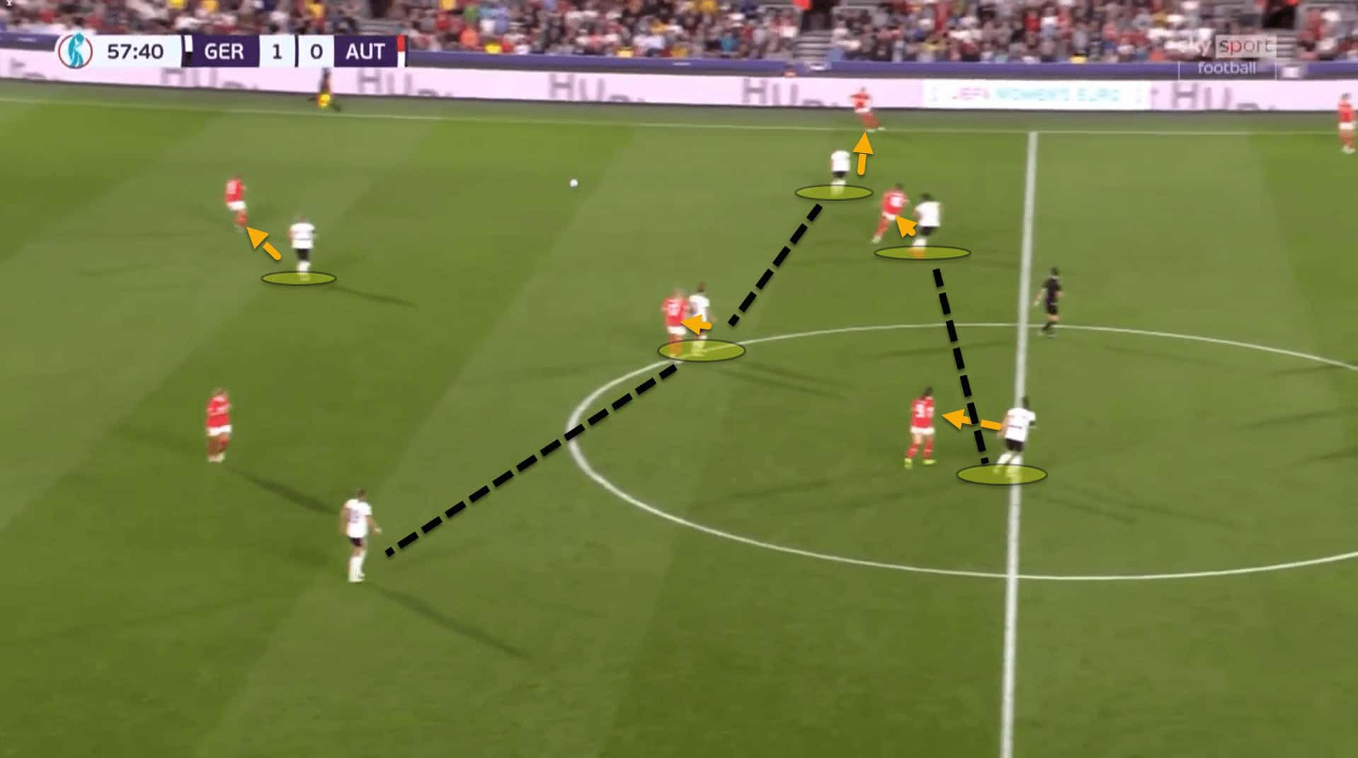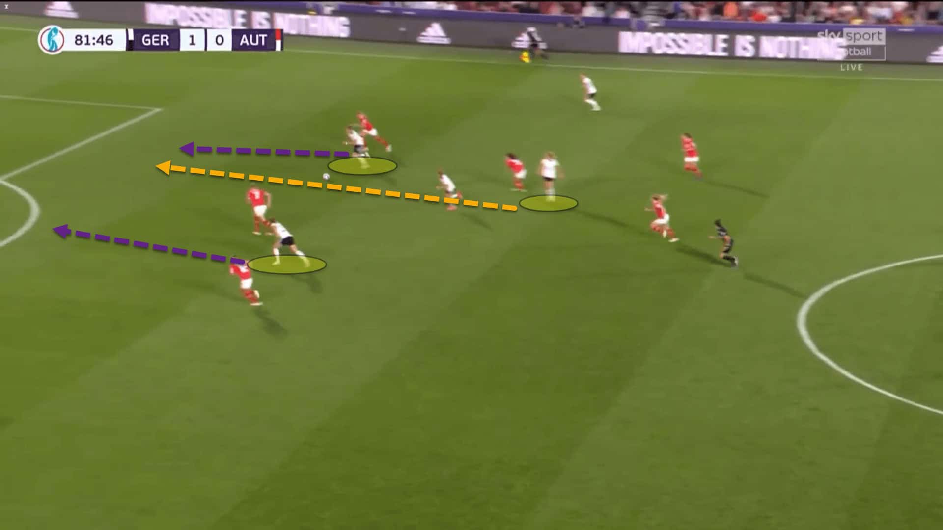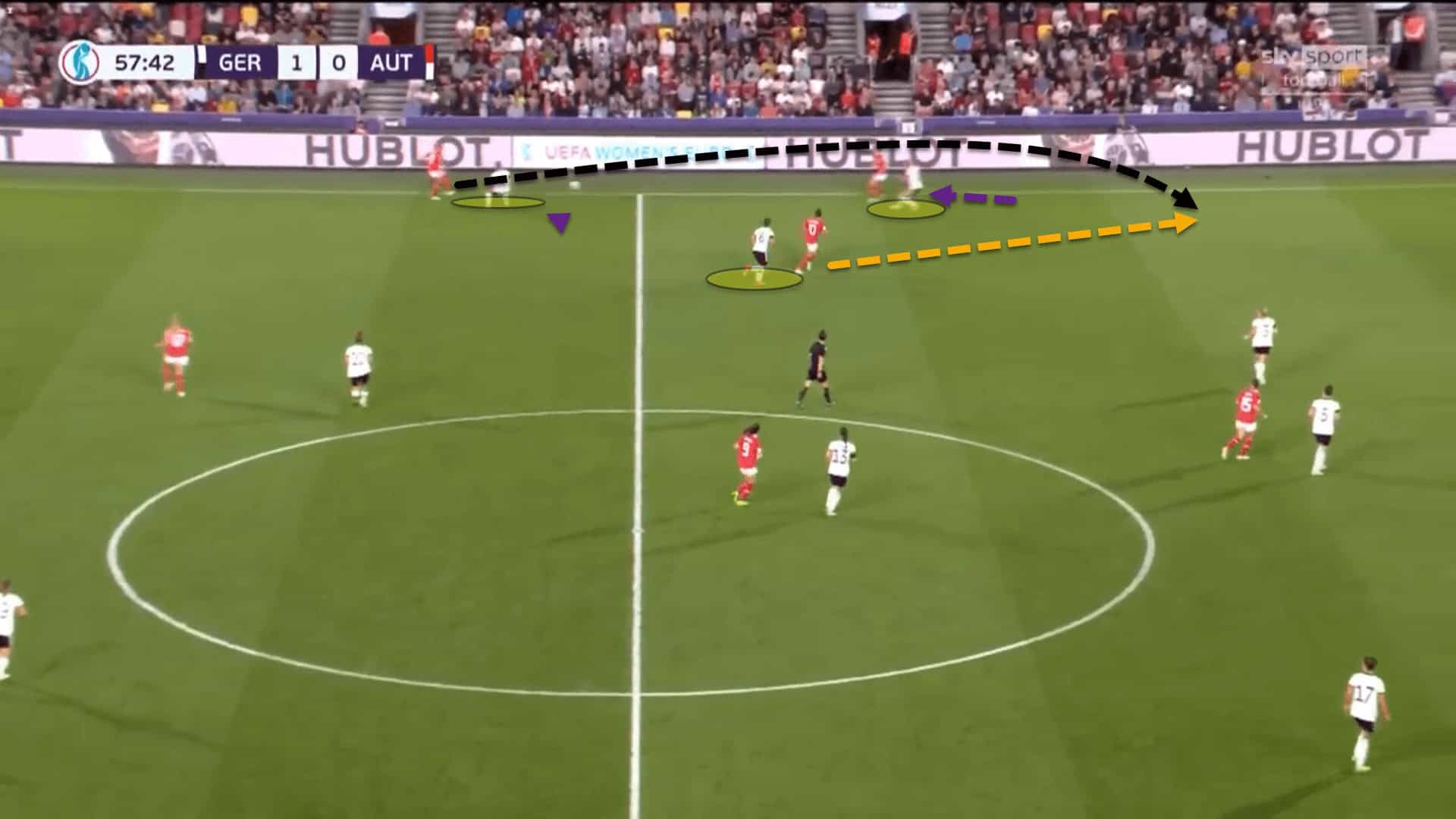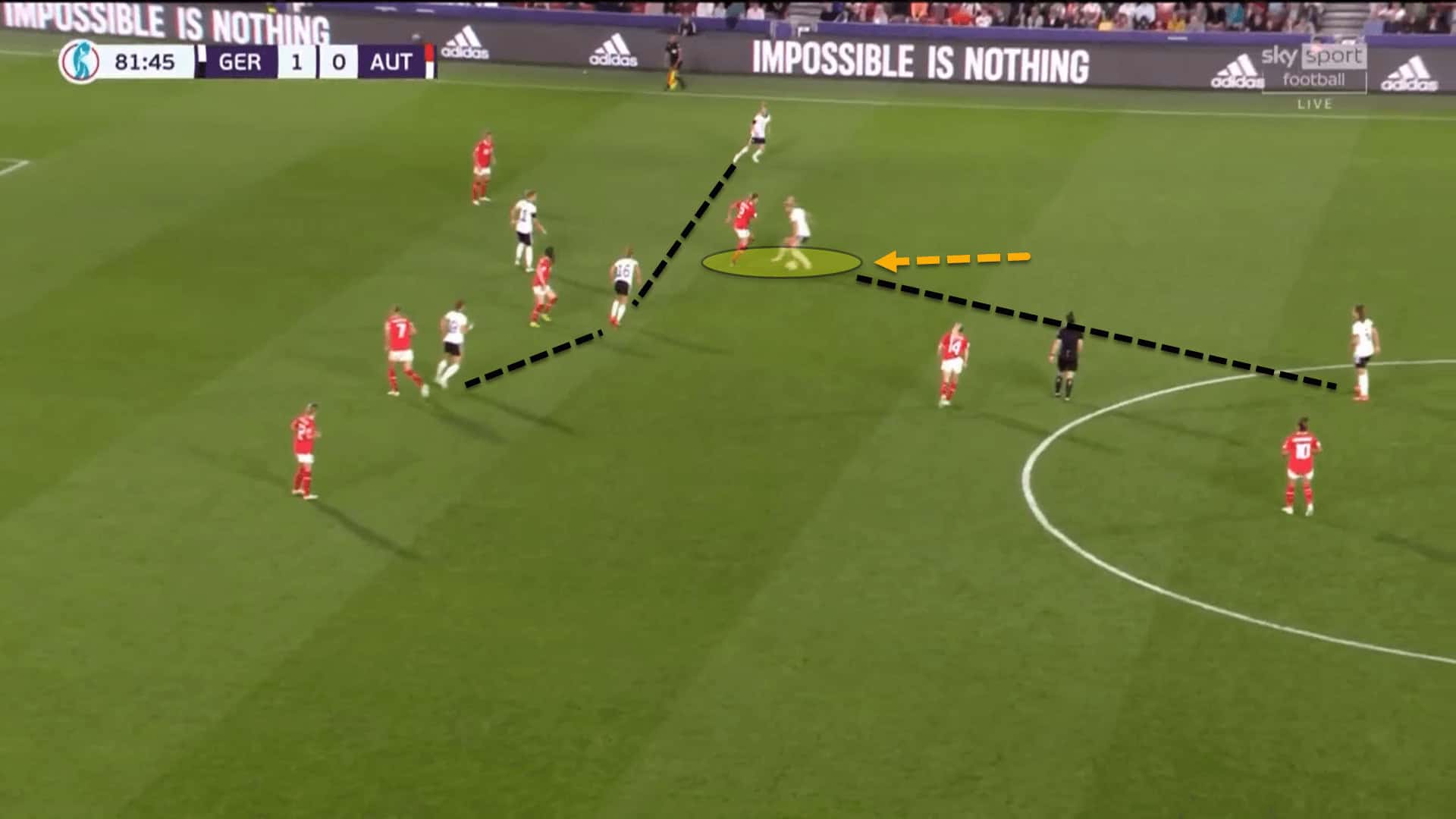 Germany’s right-back has stepped up to quickly close down the winger who has left space behind her to be exploited. Noticing this, the Austrian midfielder Laura Feiersinger makes a darting run in behind.