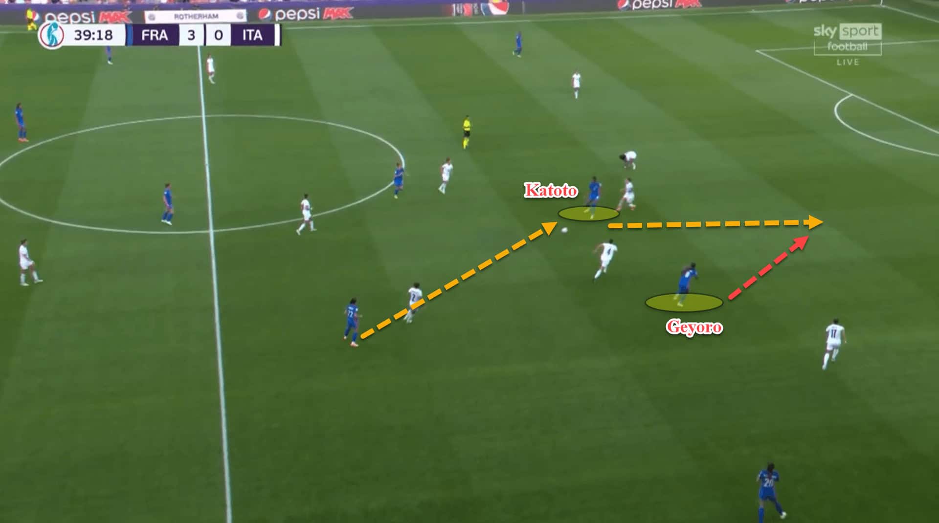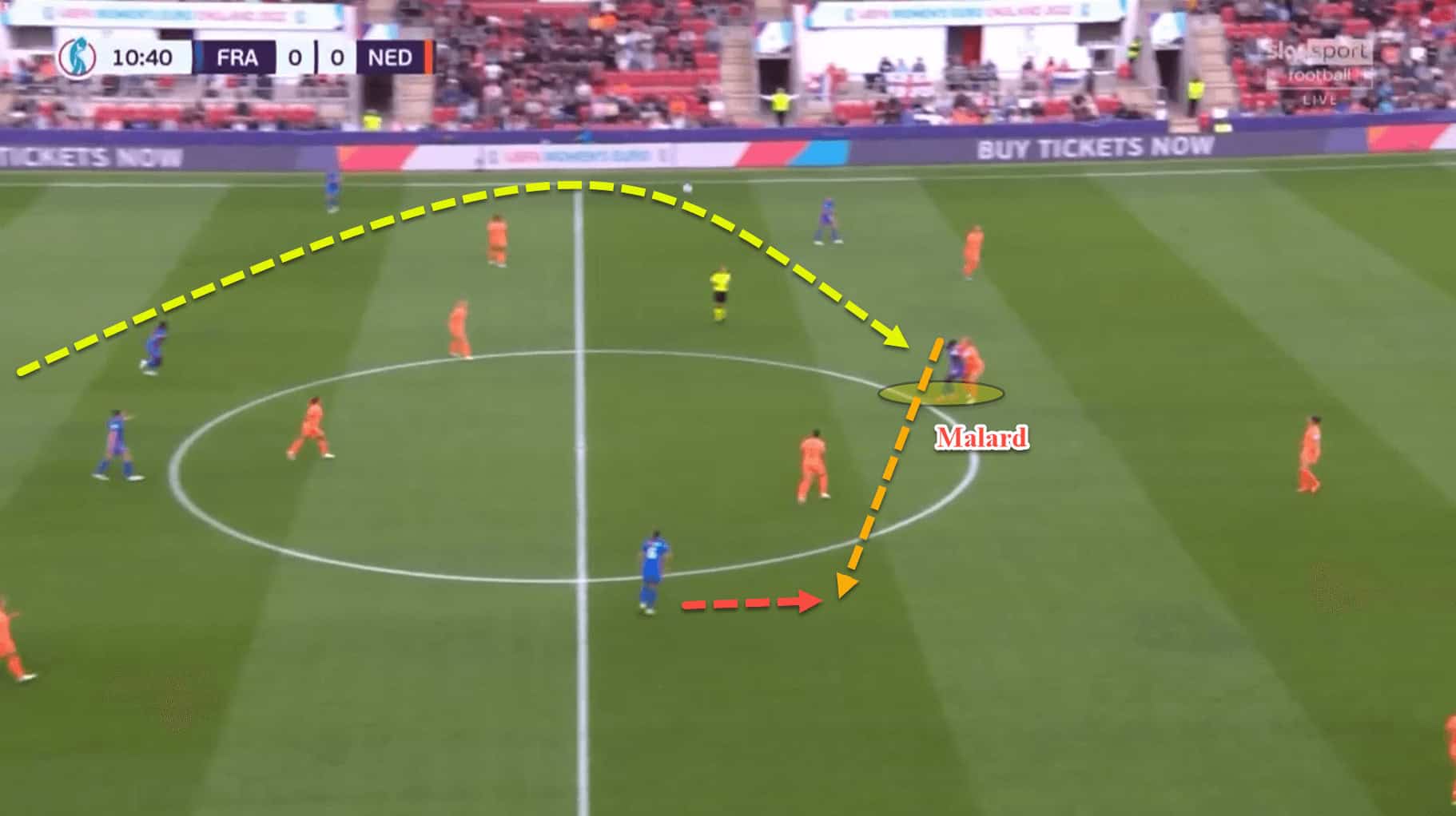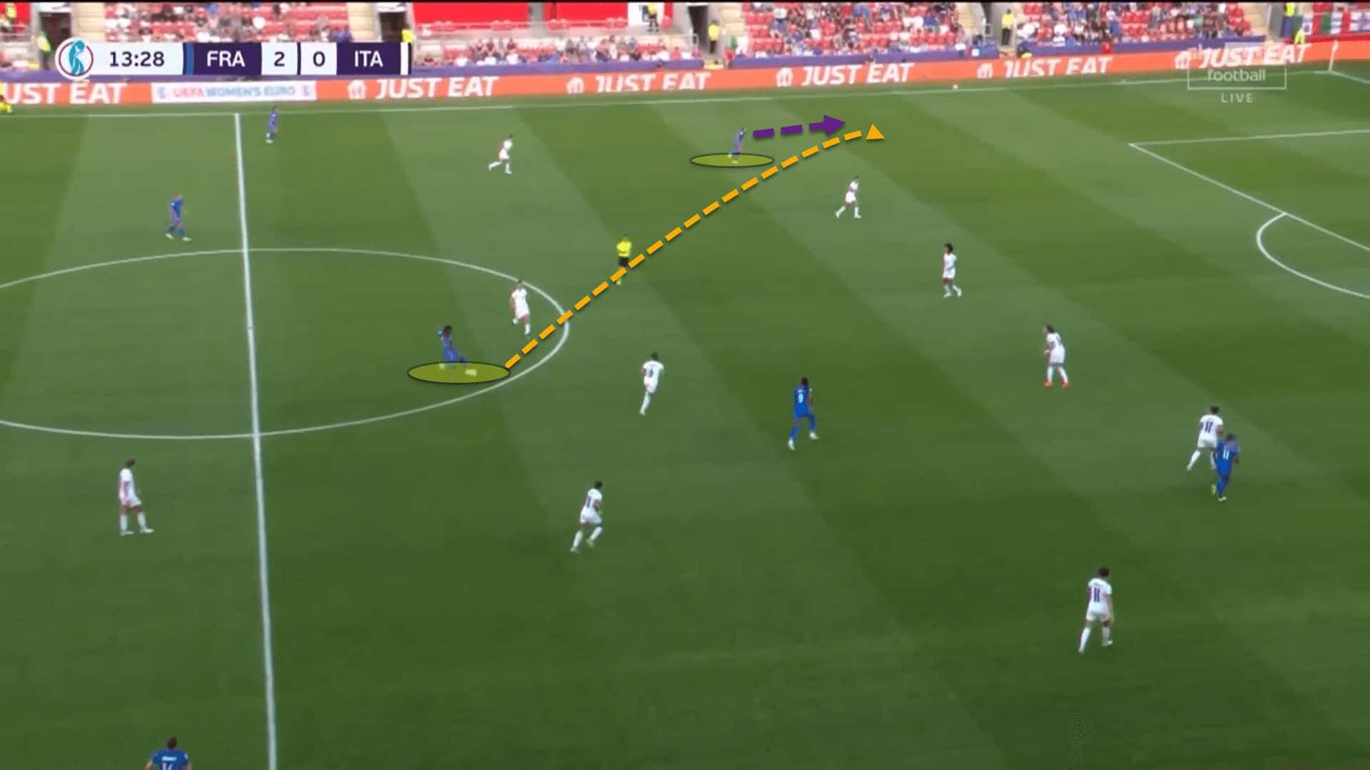 France use third-person runs all the time in order to break down defensive blocks with a higher line. Whether Marie-Antoinette Katoto plays or Malard, both are adept at dropping deep and linking up play, being used as wall-passes for third-person runs.