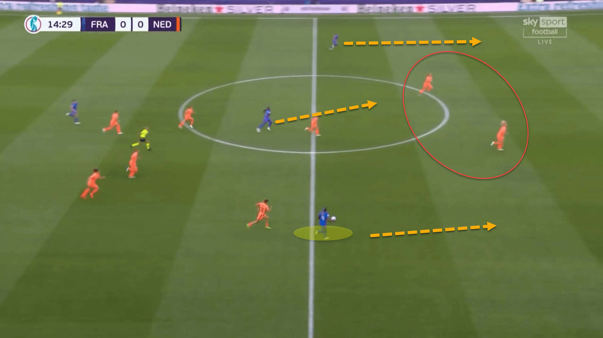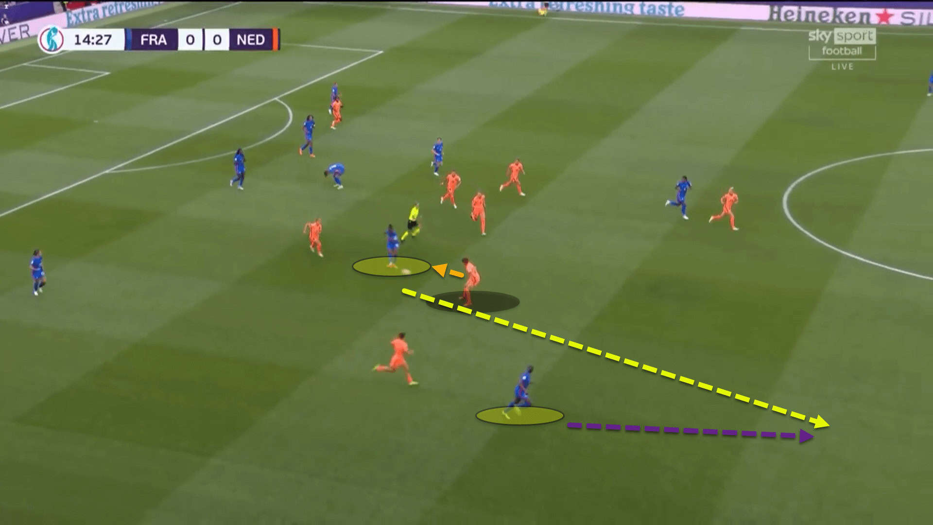 In this example, France had forced Italy to the left flank where they were able to aggressively close down the opponents in a player-to-player fashion. Even the left-back Sakina Karchaoui stepped up to tightly press the Italian winger.