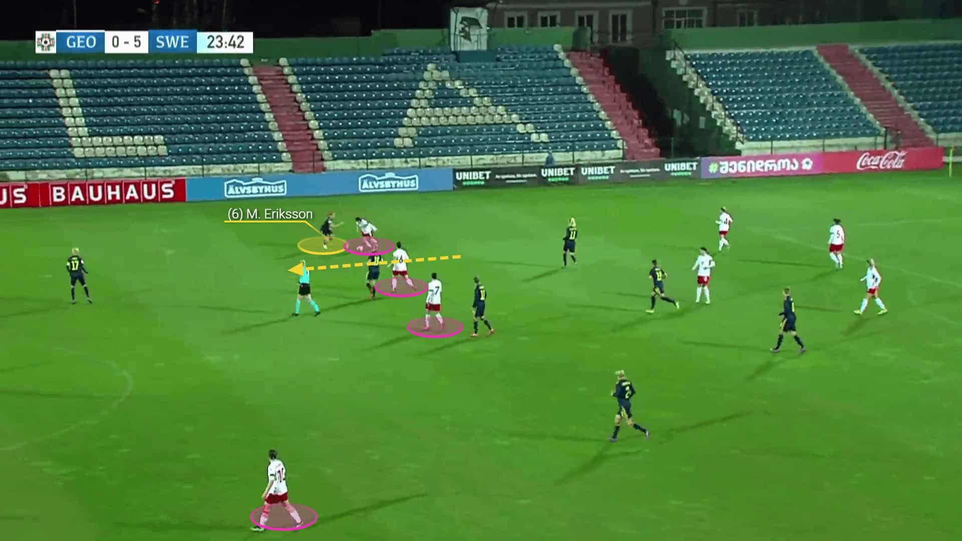 Despite Eriksson being a ball-playing defender, she doesn’t neglect her defensive responsibilities and is active both on and off the ball. One of her best qualities is her ability to recover the ball as she manages to judge the situations correctly and use her positioning and movement to gain back possession. She also has an active presence in the air, which often helps the team in the opposition’s penalty area. Her partner in crime Ilestedt has similar strengths which form a solid base for the team to be confident and attack.