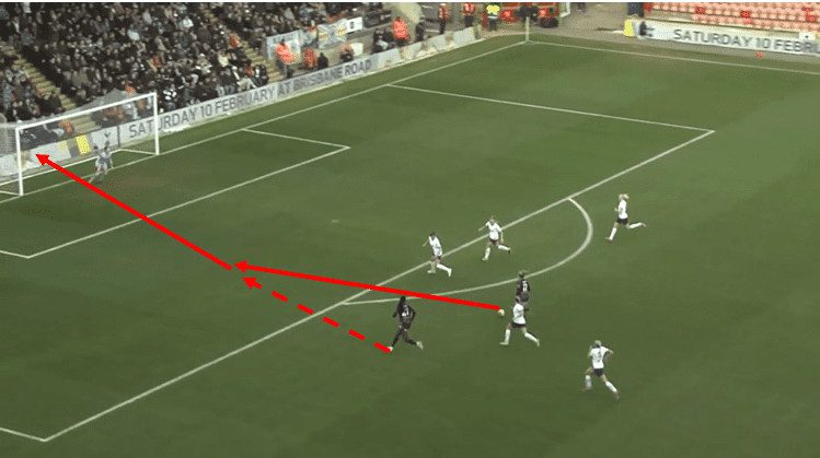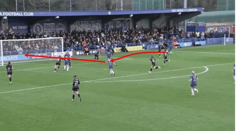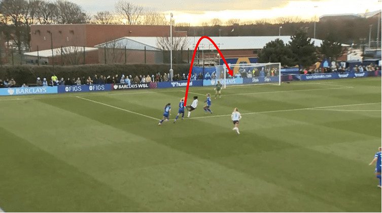 In this example above, Chelsea is struggling to break down a Crystal Palace side who have sat back behind the ball for a large proportion of the game. However, late on in the game, Ramirez gets a half-chance. She creates this opportunity by being in space away from the defender. Lawrence plays the ball behind Ramirez, where she is forced to flick the ball into the net with a back heel.
