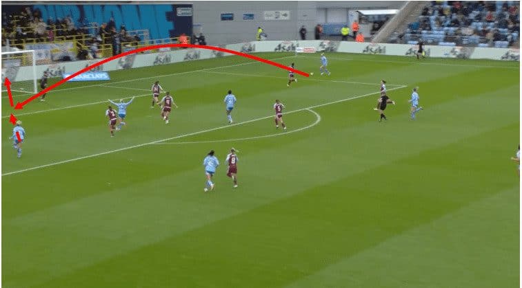 Here, with the ball played out wide to Kelly, she can pick out Hemp, who is unmarked on the back post. Hemp doesn’t have to break stride and heads the ball home as required.