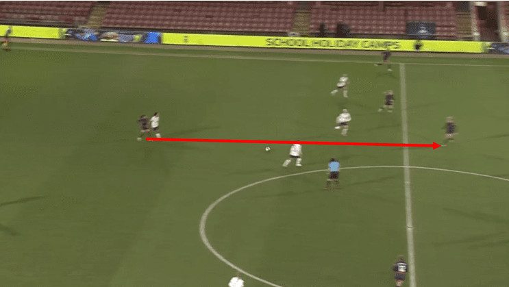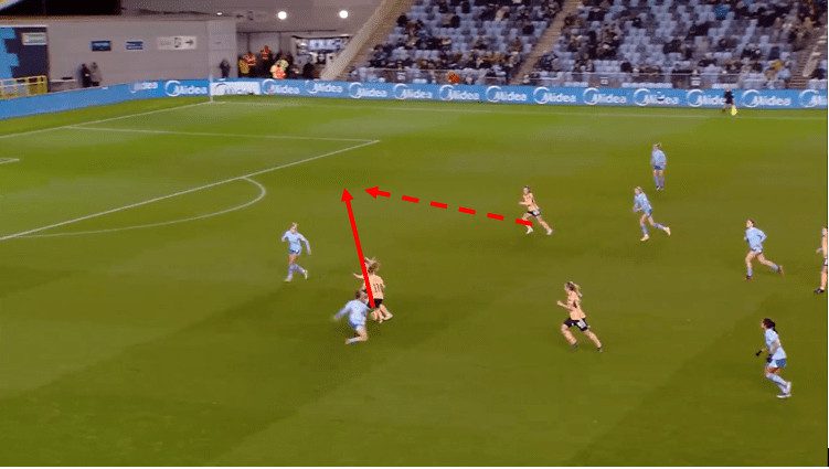 In this example, you can see Hemp receive the ball centrally between the lines and then from here; she can turn and play a ball to Kelly down the right flank, putting her into space and thus acting as the link from defence to attack.