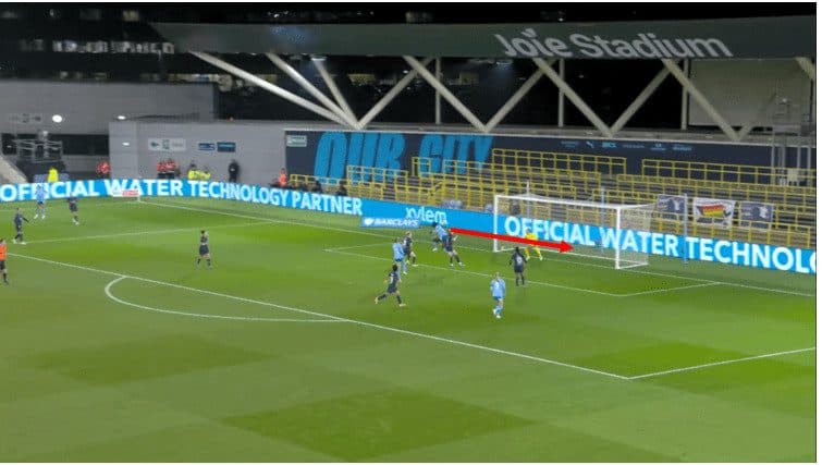 In this example, you can see the aggressive city shape with Coombs and Park putting pressure on the two Arsenal pivot players while Kelly on the left, in this case, looks to block the passing lane to the outside.