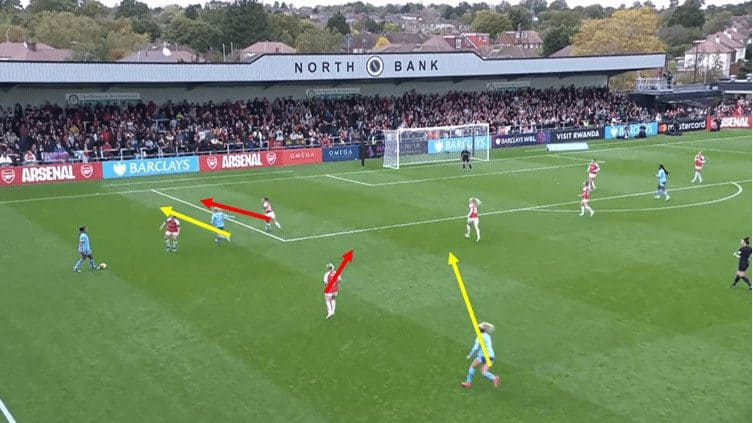 In terms of nullifying the City side in possession, Brighton and Arsenal showed a blueprint for beating them defensively. City wants to be dynamic in wide areas with lots of movement between midfielders and forwards. How Brighton and Arsenal dealt with this was to go with a man-marking system within the midfield, always being picked up by an opponent. Additionally, the wingers were tasked with tracking any runs by City full-backs.