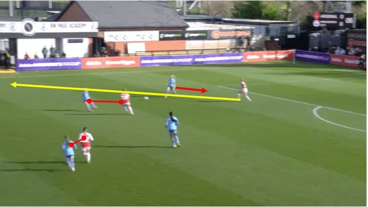 The ball is played wide to City’s Kelly in this example above. However, the thing to highlight is how Brighton’s central midfielder, Vicky Losada, tracks Angeldahl from the inside, forcing her to go wide and eventually play the ball backwards.