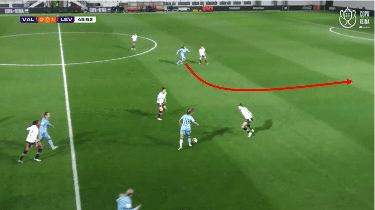 This example above comes from Ramirez’s time at Levante, with number ten Alba Redondo winning the ball back high up the field. Valencia is left thin for numbers as a result. Ramirez identifies this and makes a well-timed arched run into the gap to get in behind the defence; once there, she uses her strength and power to hold off the defender and get into a dangerous goalscoring position.