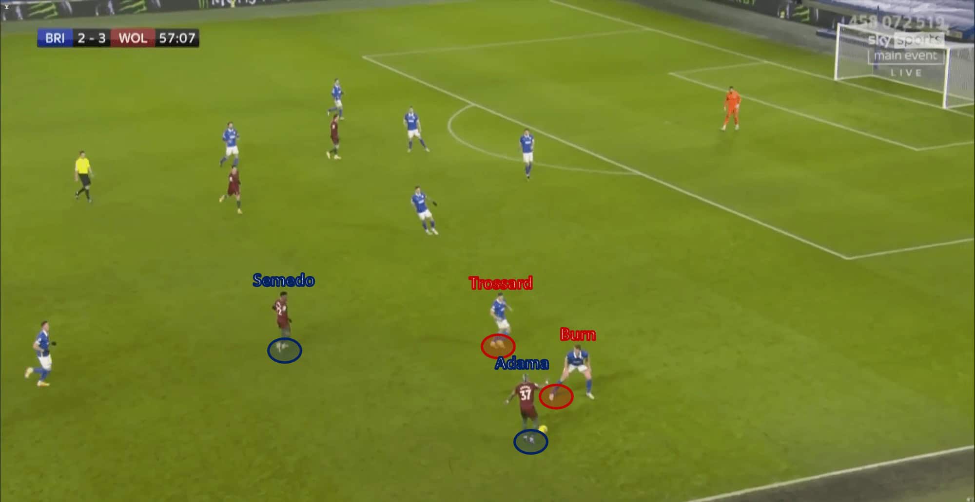 Burn has the outside option covered, and in tandem with Trossard, he is cutting off Adama inside too.