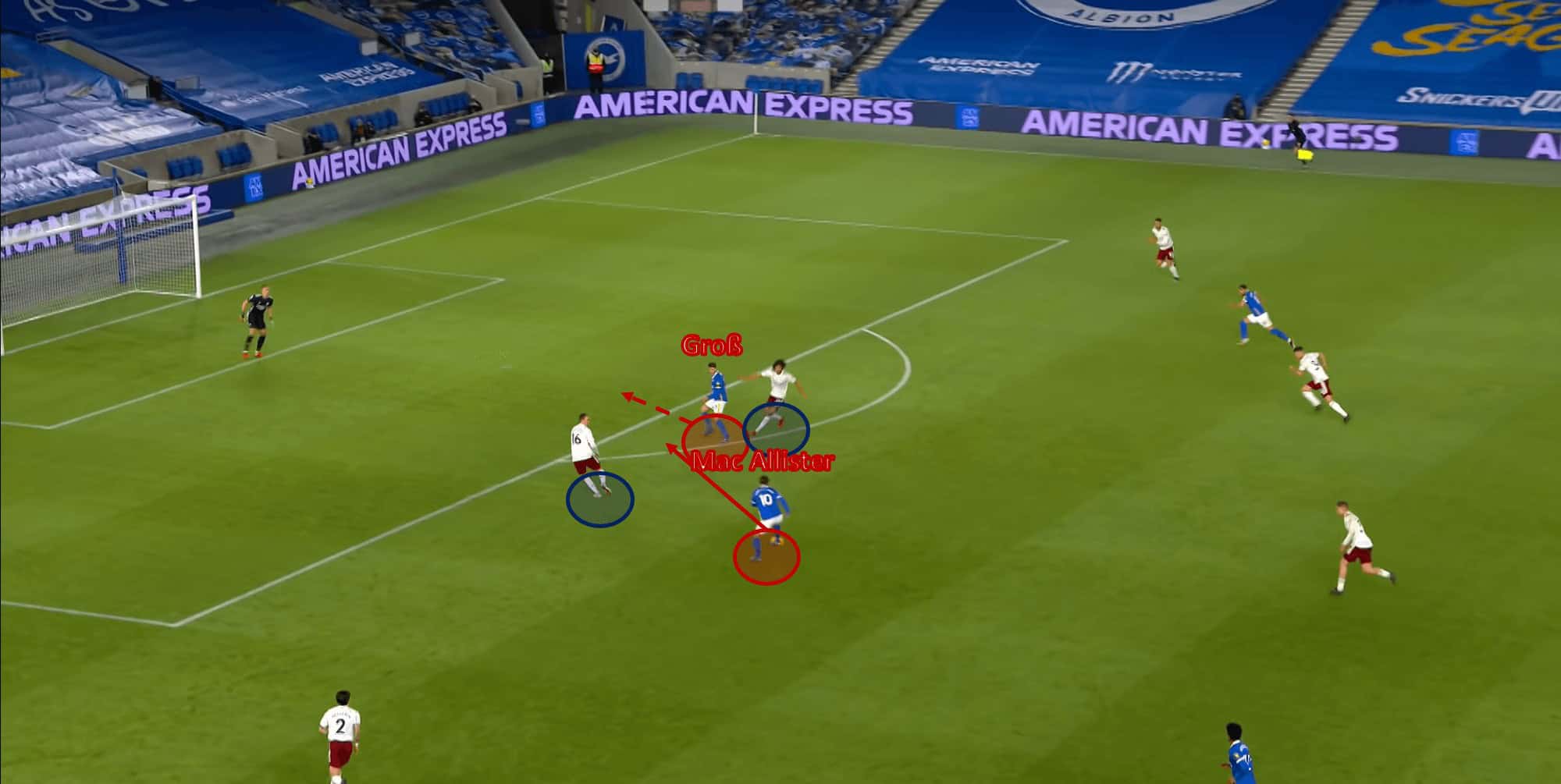 Groß can be found here making a darting run beyond Arsenal’s backline.