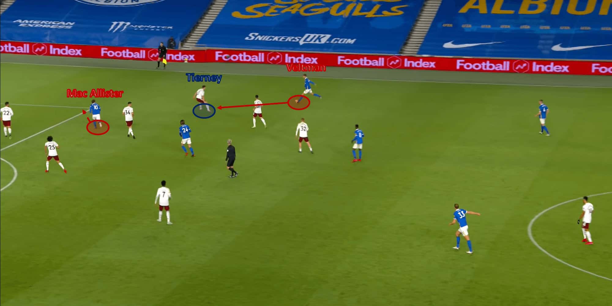 Veltman begins to play the early cross, with Mac Allister making the blindsided run on the outside.