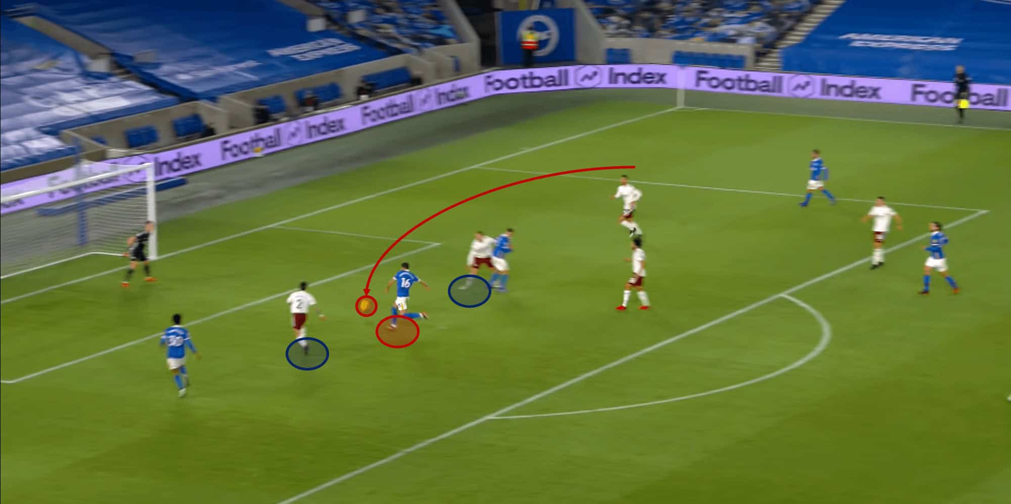 He spearheaded a 3-4-2-1 formation, which would transform into a 3-4-1-2, with Leandro Trossard moving centrally into the #10 space and Neal Maupay slotting to the left of Connolly to create a striking partnership in possession.
