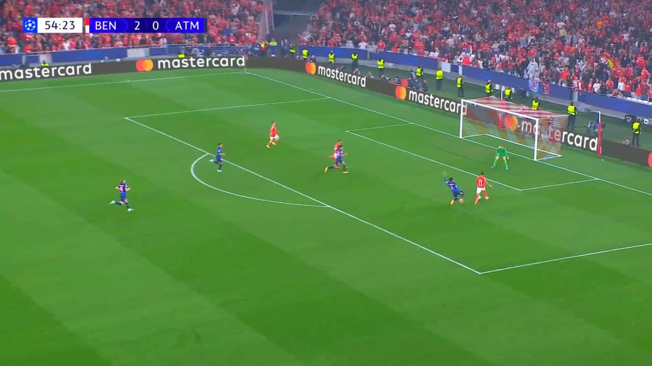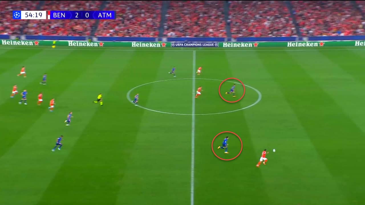 After scoring their second goal, Benfica decided to rely on counterattacks a bit further, using their pacy wingers to reach the box quickly and try to punish Atlético Madrid for advancing to score.