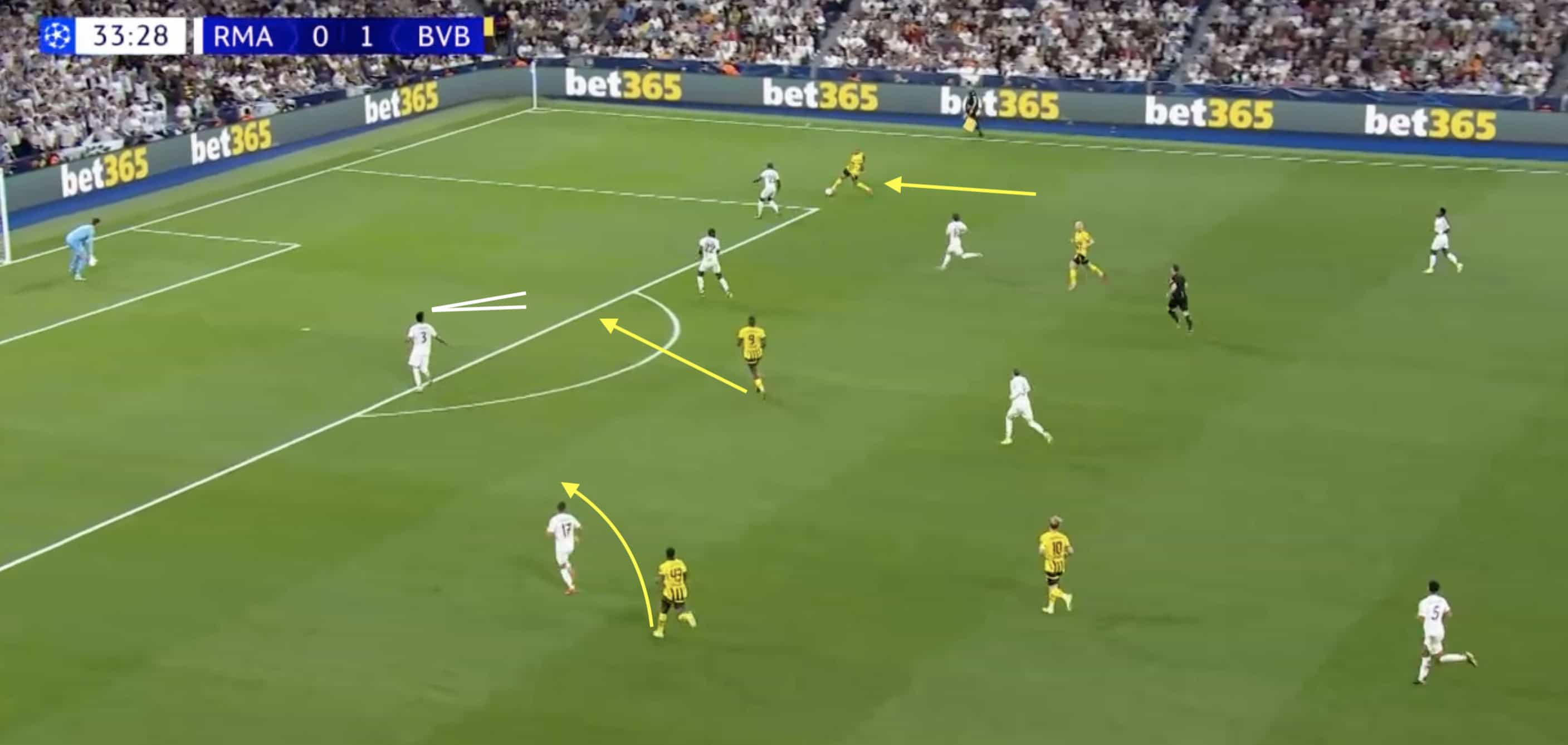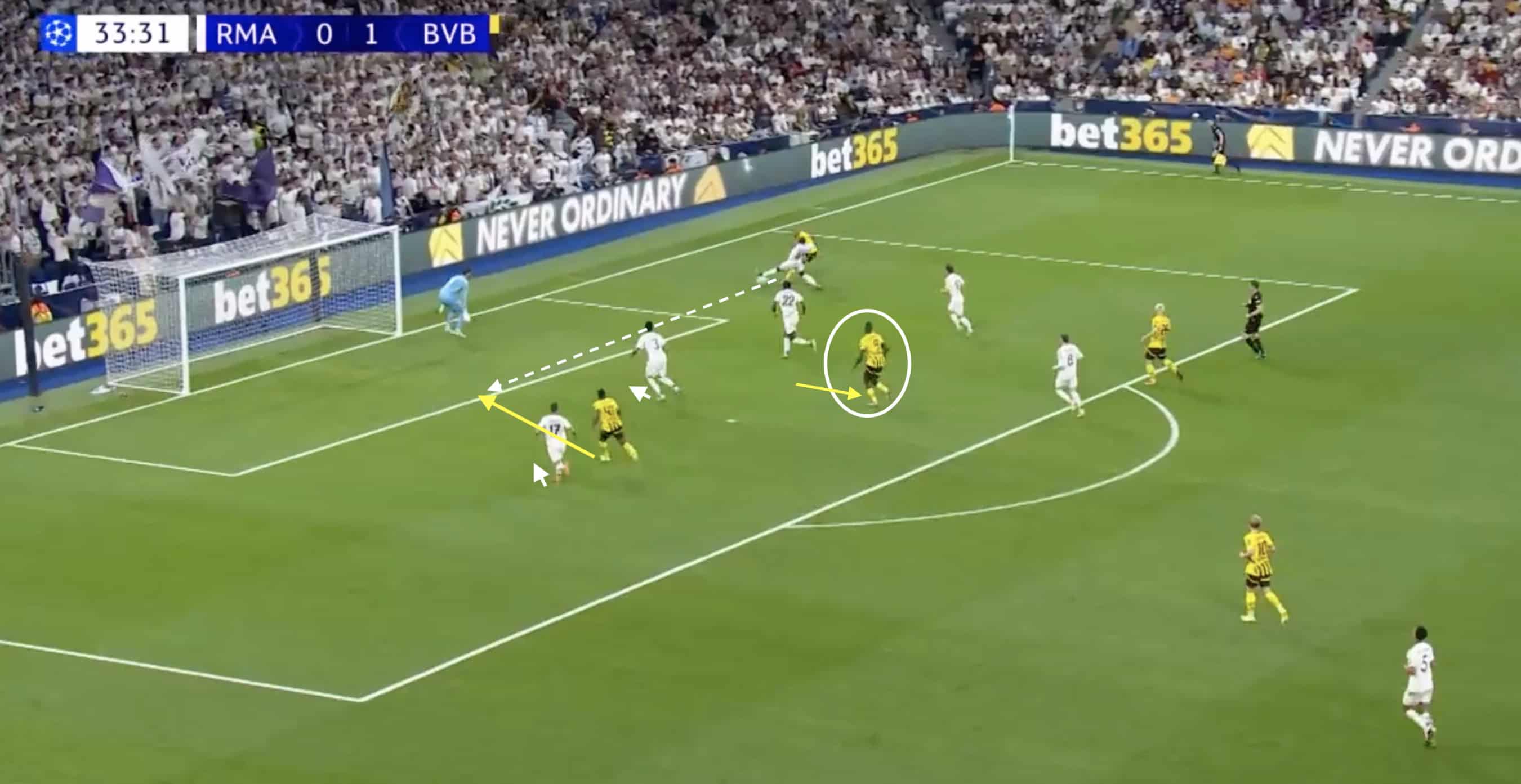 As the play progressed on the right flank, Guirassy initially appeared as though he would make a traditional dart into the penalty area, splitting both Militão and Rüdiger.