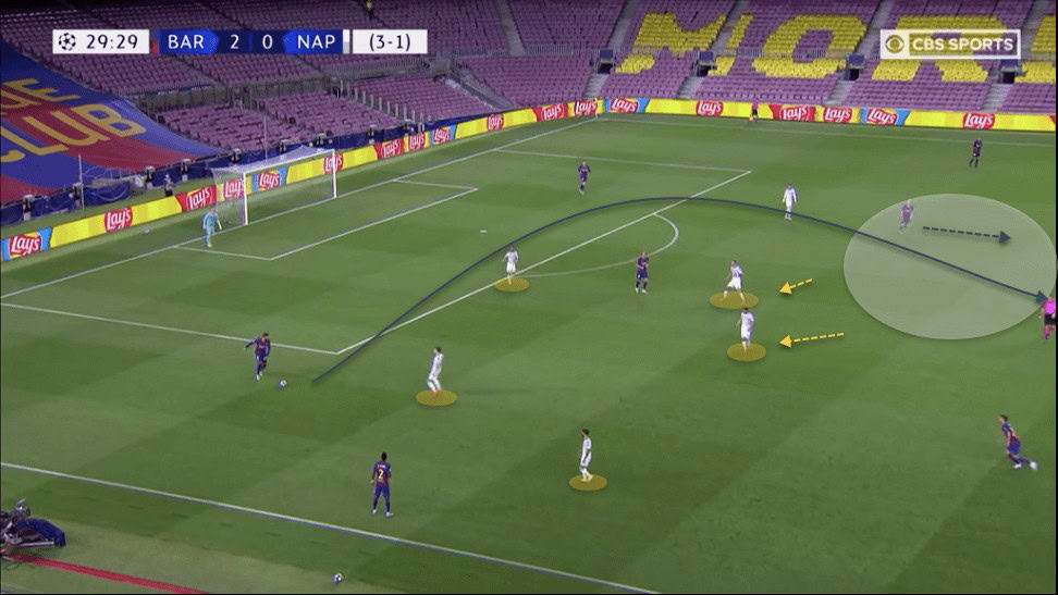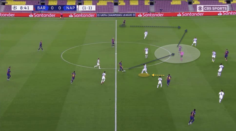 Demme is closely marking Messi. However, due to the ball positioning and team structure, his presence in this position is not where he is needed the most. Napoli already have three players defending in this area, with Rui marking Semedo out wide and Insigne and Fabian blocking off this passing lane into Messi.