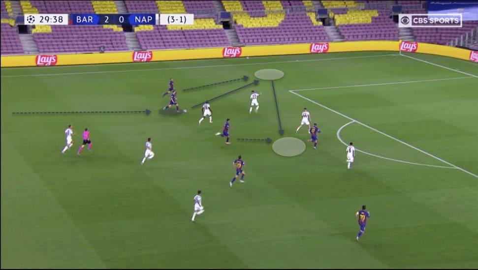 The intent of this positioning and midfield orientation was to draw out Napoli’s midfielders. De Jong and Sergi Roberto dropped into these half-space positions to provide a link to the centre-backs with the full-backs vacating this area. These movements pulled out Ruiz and Zieliński from their midfield line. Once this successful in opening space in the centre, Barcelona looked to find the exposed Demme by finding Messi and Griezmann in a 2 v 1 with the holding midfielder.