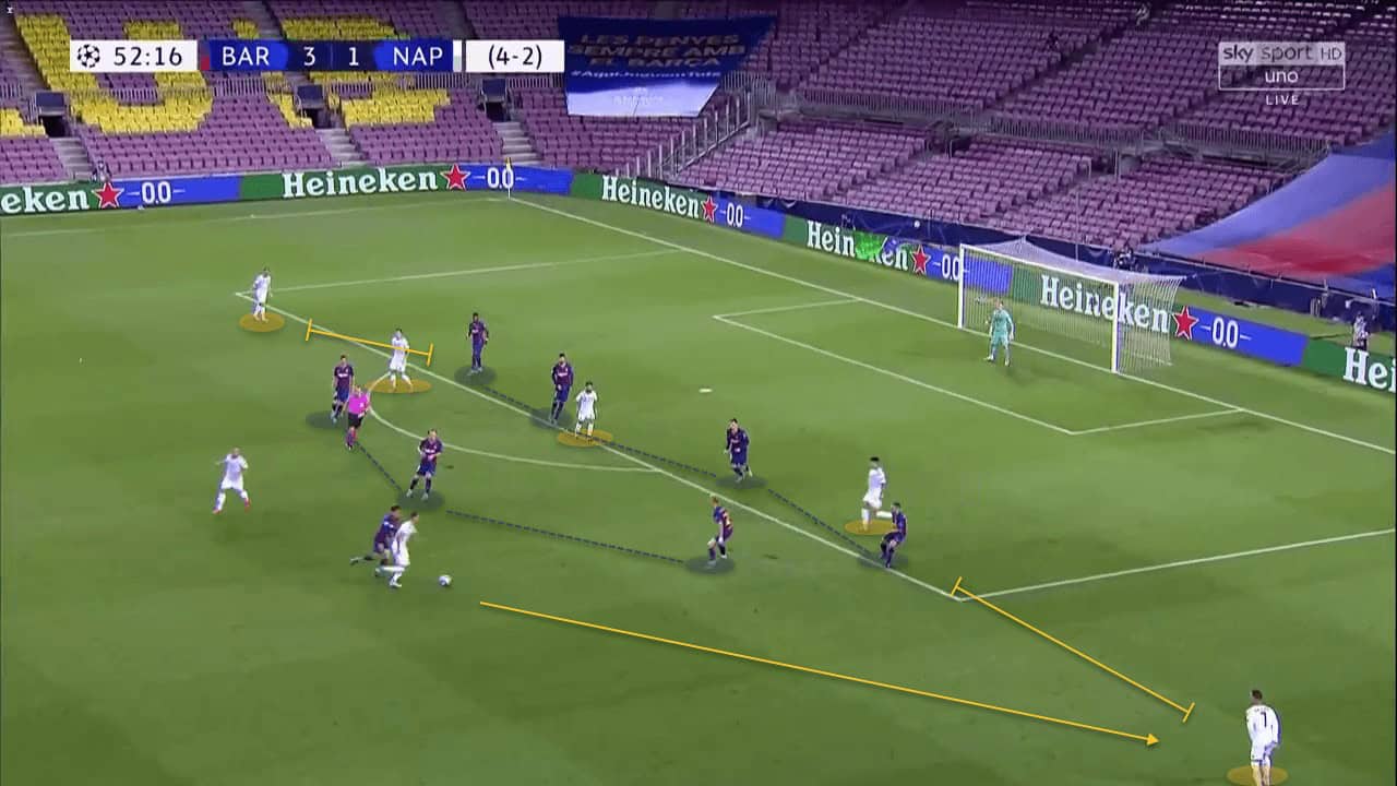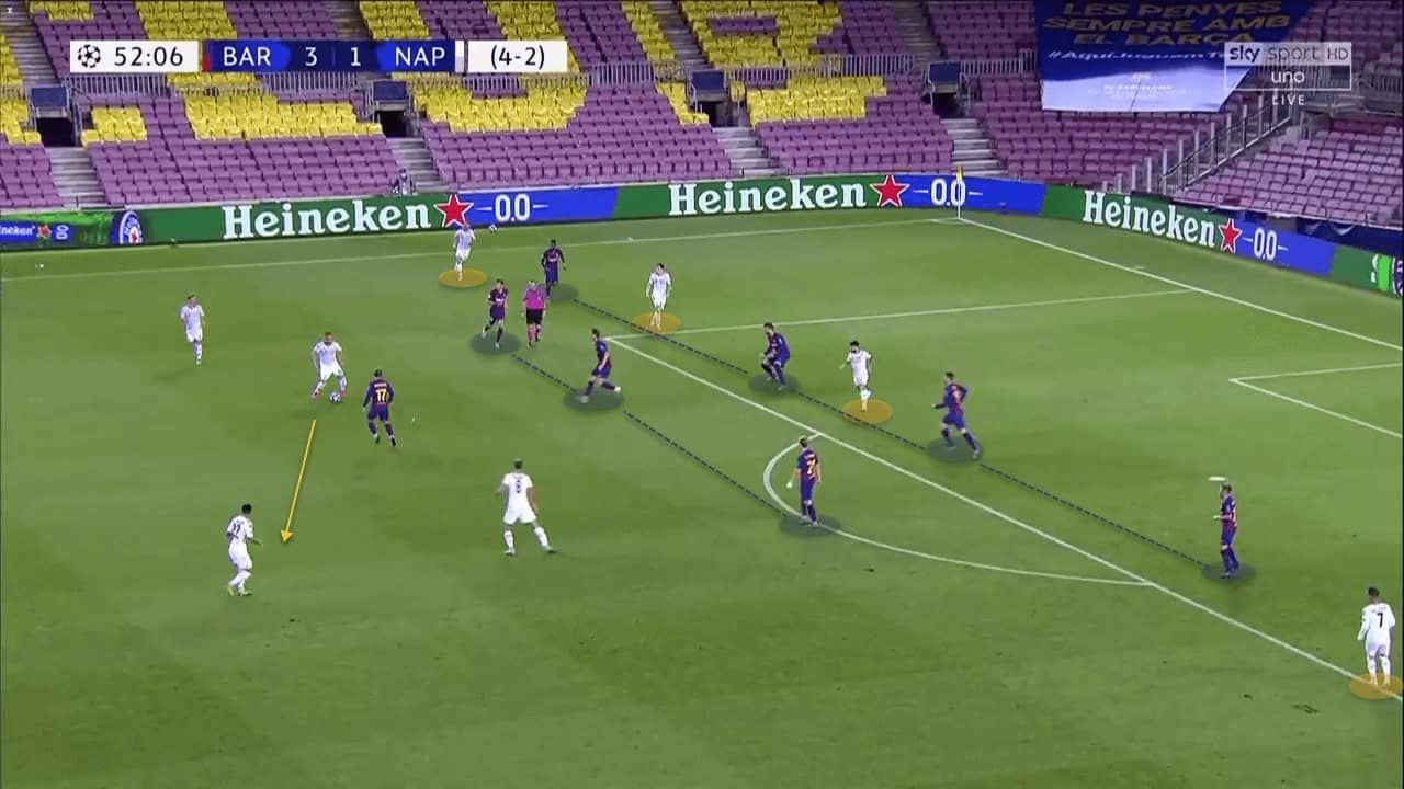 They moved play from side to side through Demme and the second holding midfielder, as Barcelona sat deep and soaked in the pressure. Napoli failed in creating ways to open up this defensive block, as the home wide sat very compact with their defence and midfield lines. As you can see, the only options Barcelona allowed were the wide players, as they were much more comfortable in giving Napoli crossing opportunities rather than allowing them space inside for the creative likes of Insigne and Fabián to have room to manoeuvre on the ball in these areas.