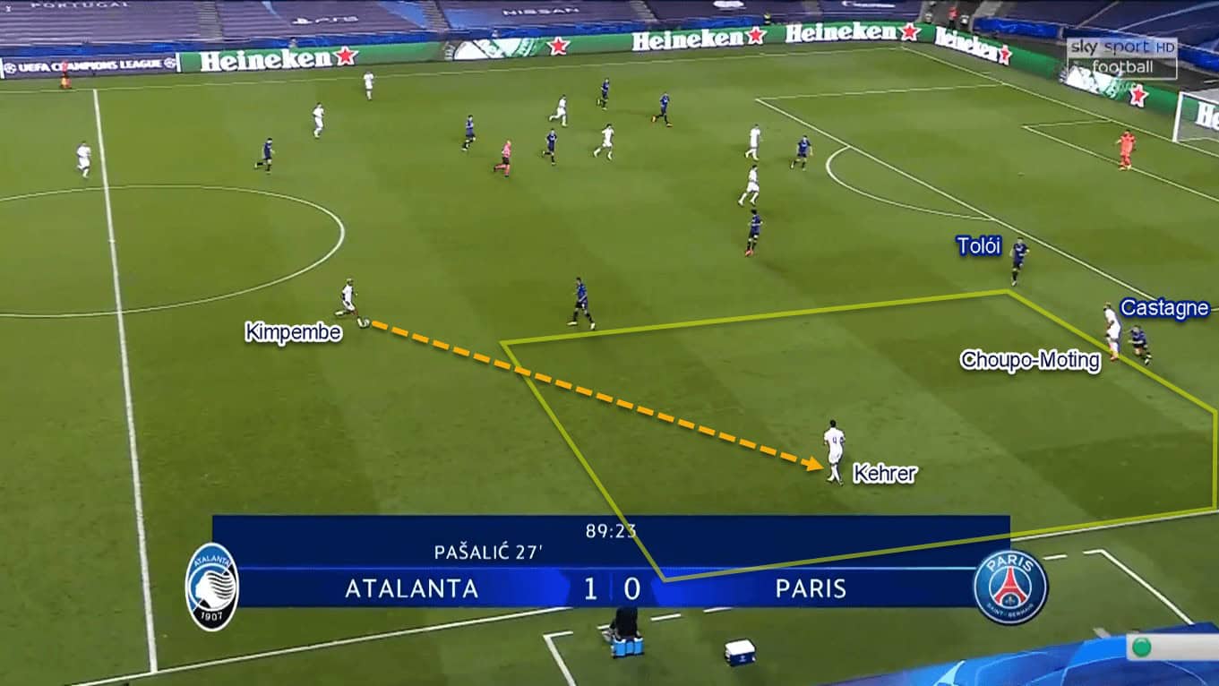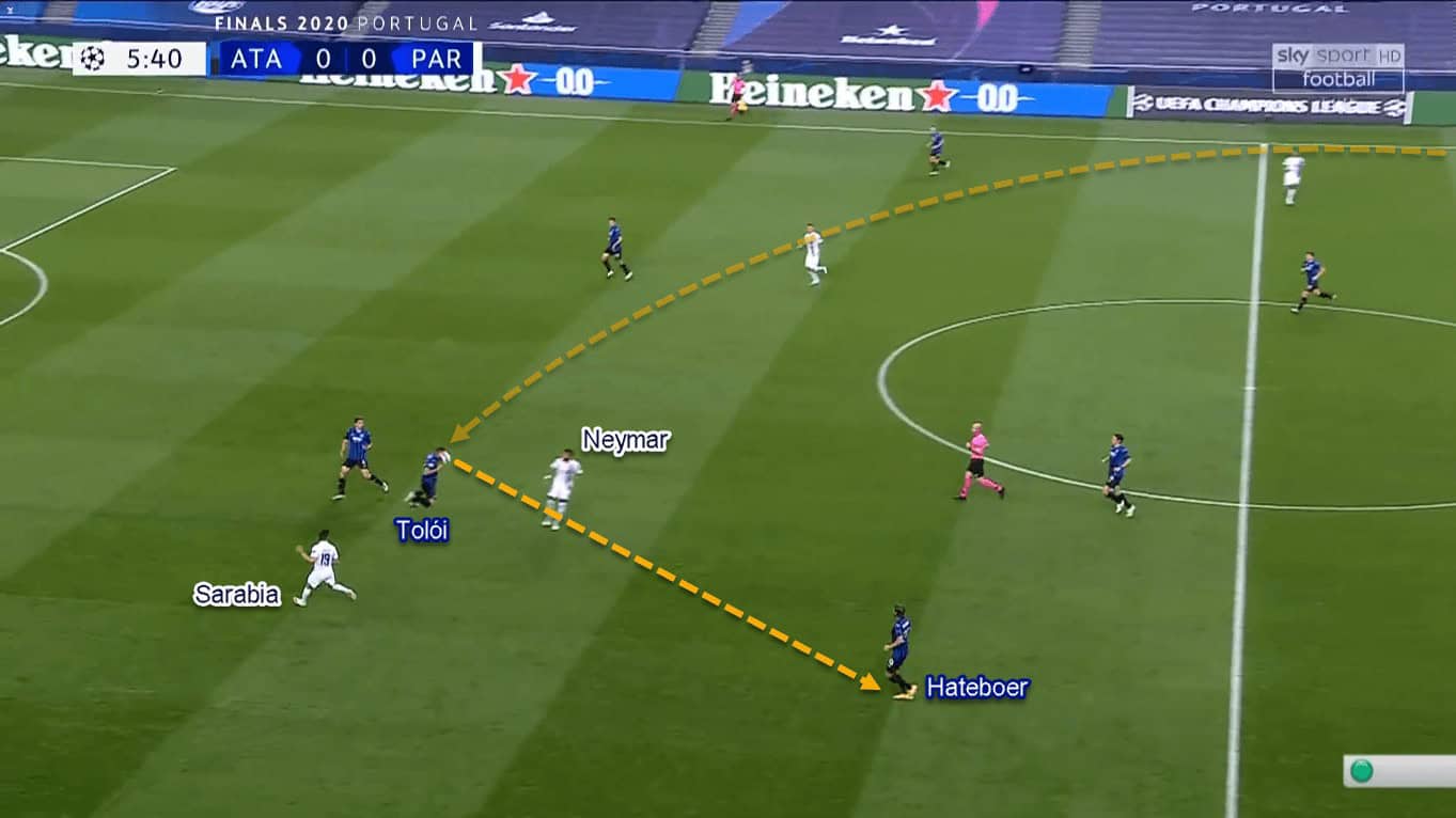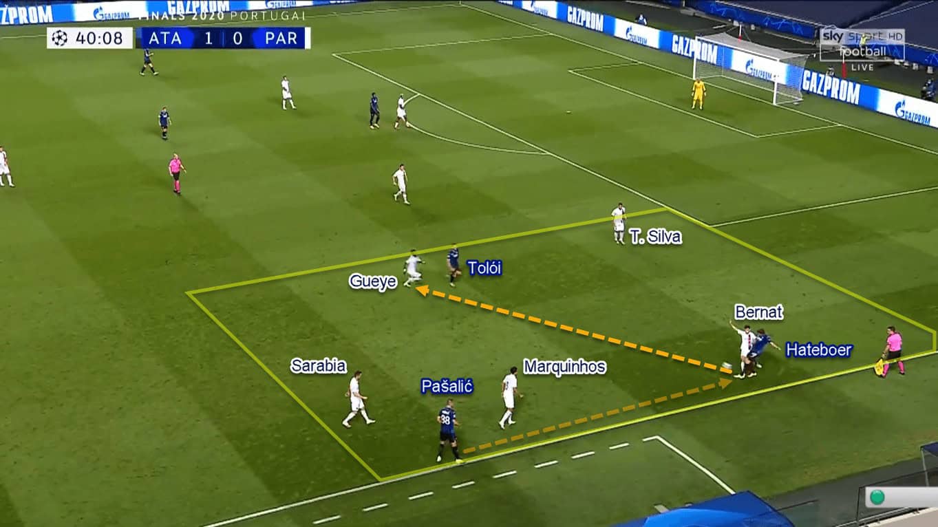 That issue was the huge space allowed in front of their wing-backs. This issue could be found more often in the far-side area. It means that if PSG try to attack positionally from the left — therefore having more players in that area — the area in front of Atalanta’s right wing-back would be completely open. The men in white then would try to find their far-side full-back through their centre-backs.