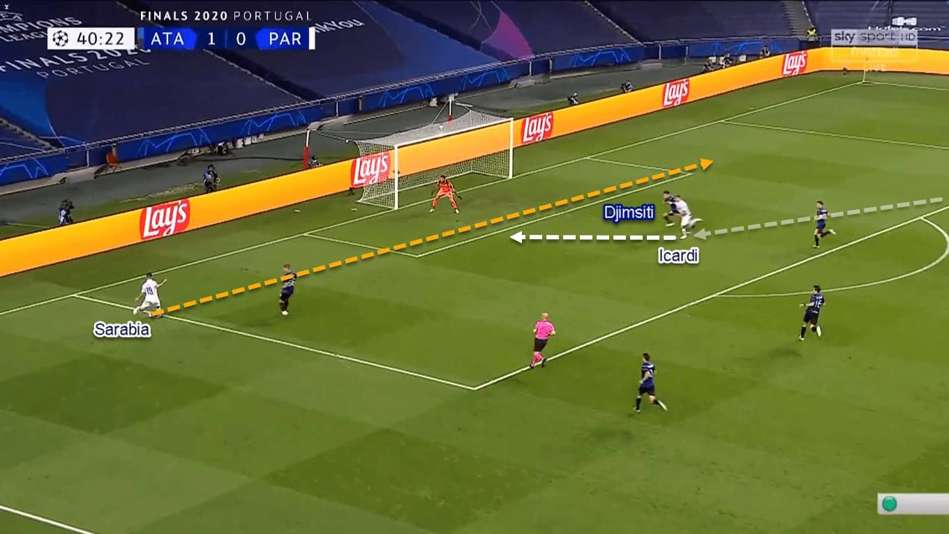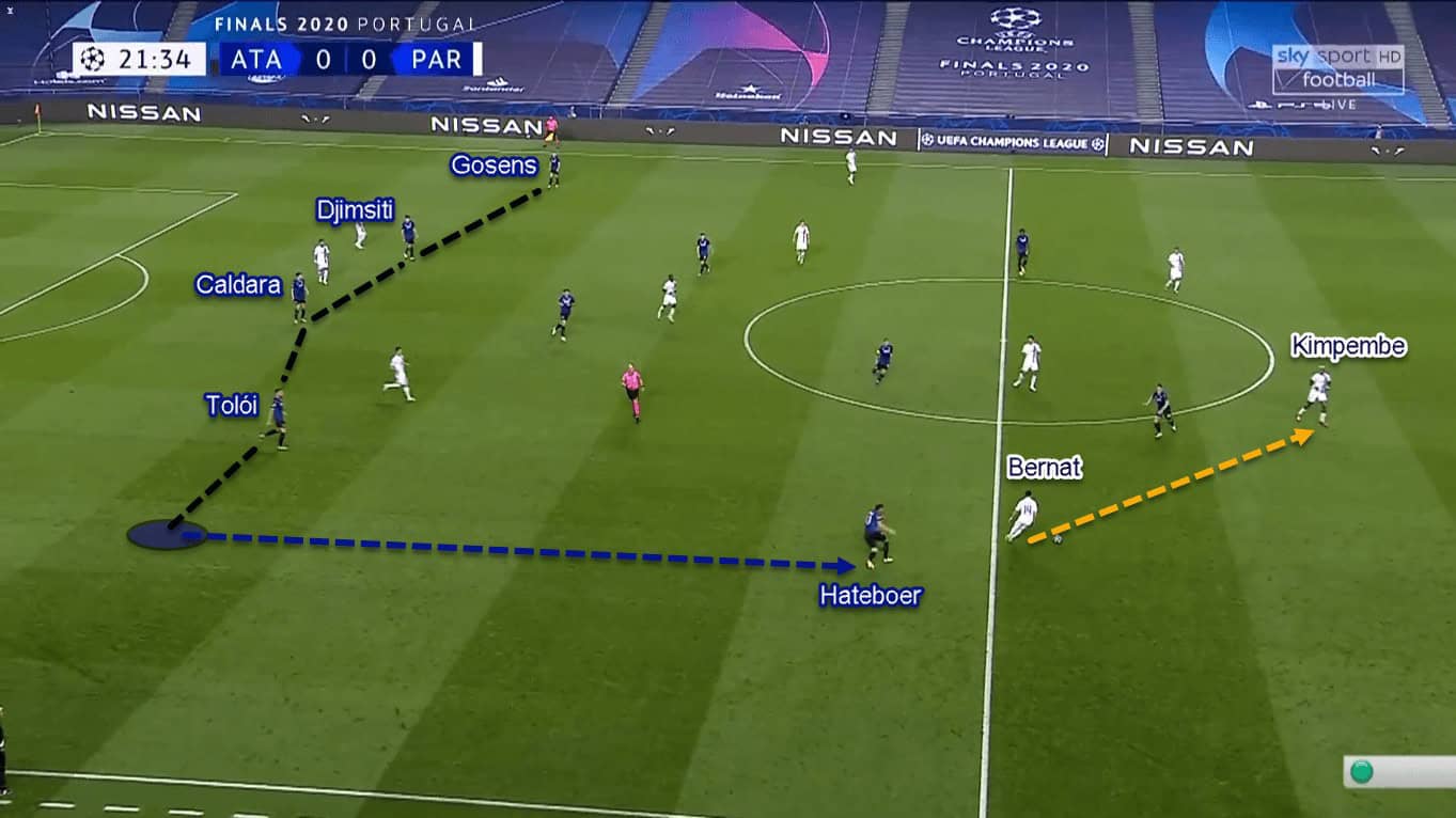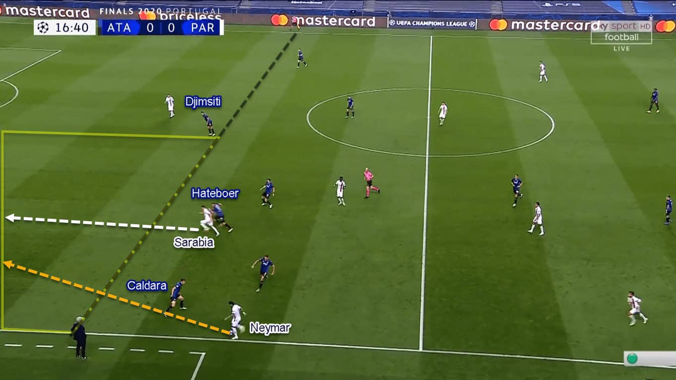 That issue was the huge space allowed in front of their wing-backs. This issue could be found more often in the far-side area. It means that if PSG try to attack positionally from the left — therefore having more players in that area — the area in front of Atalanta’s right wing-back would be completely open. The men in white then would try to find their far-side full-back through their centre-backs.