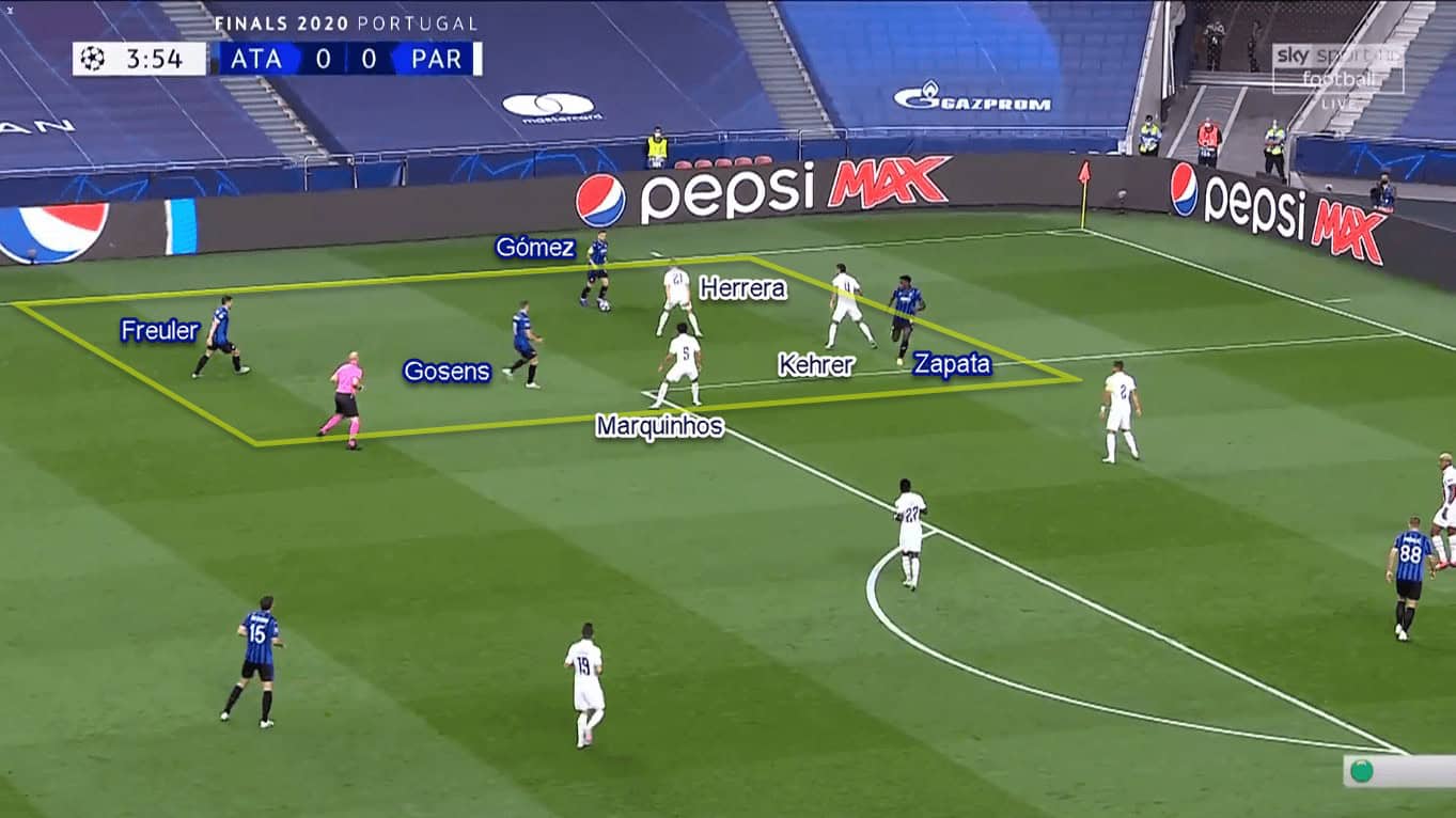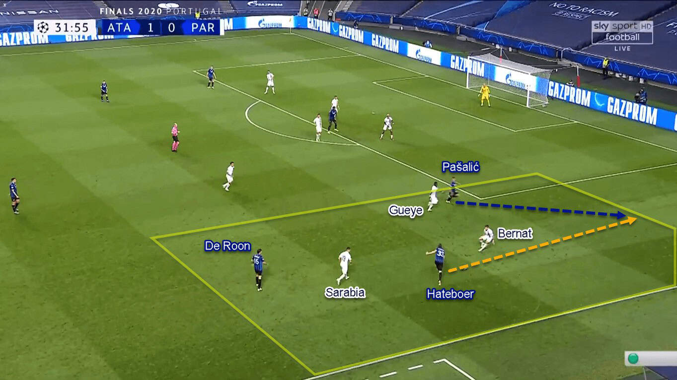 On some occasions, Atalanta could muffle this threat. That was by allowing their far-side wing-back to step up quickly and close the PSG’s receiver immediately. Sometimes it would also force the French side to play negatively due to the limited space.