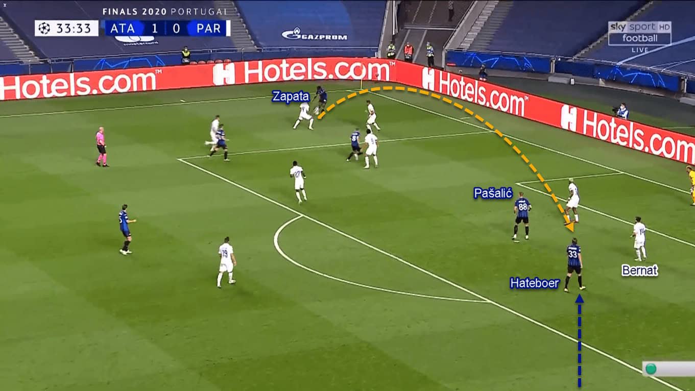 Zapata — who couldn’t control the ball perfectly — gave the ball away to incoming Freuler in the opposite half-space. The midfielder then returned the ball to Zapata, who once again didn’t have a sublime control on the ball. Kimpembe then stepped up to clear the ball. However, the clearance hit Zapata and somehow found Pašalić in the right half-space. The former Chelsea player then sweetly struck the ball home with his first touch.