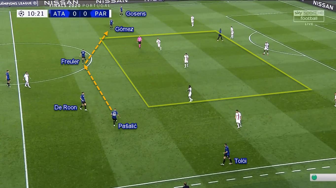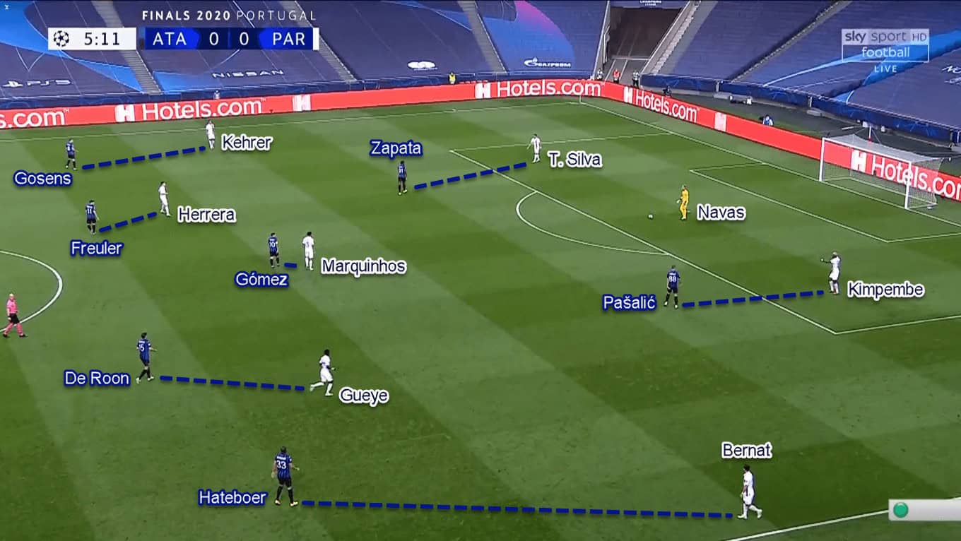 In their defensive tactics, both PSG centre-backs were occupied by Pašalić and Zapata. Behind them, Gómez was tasked to prevent Marquinhos to be accessed. Then, there were four players to cover PSG’s midfielders and full-backs. Those were Remo Freuler and Marten de Roon in the middle, as well as Robin Gosens and Hans Hateboer in their respective flanks. Les Parisiens’ attacking trident was also followed closely by each of Atalanta’s centre-backs in their respective area.
