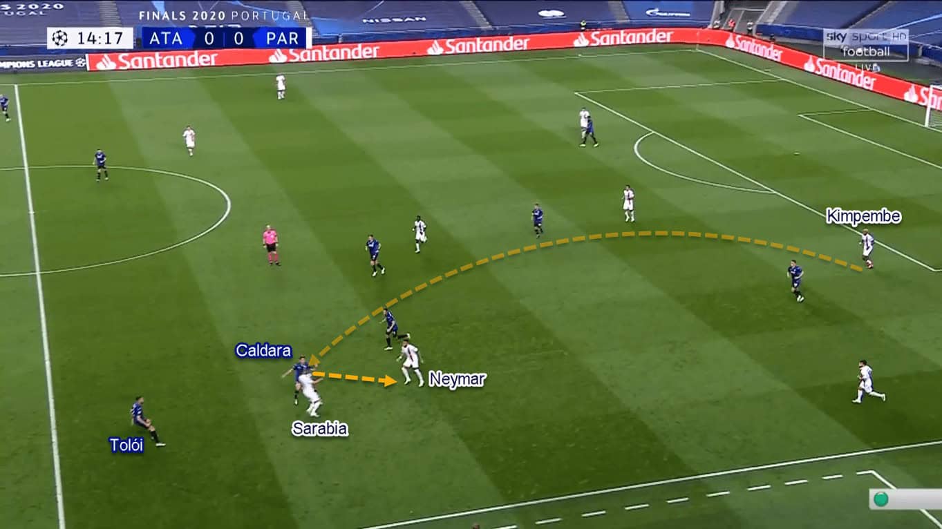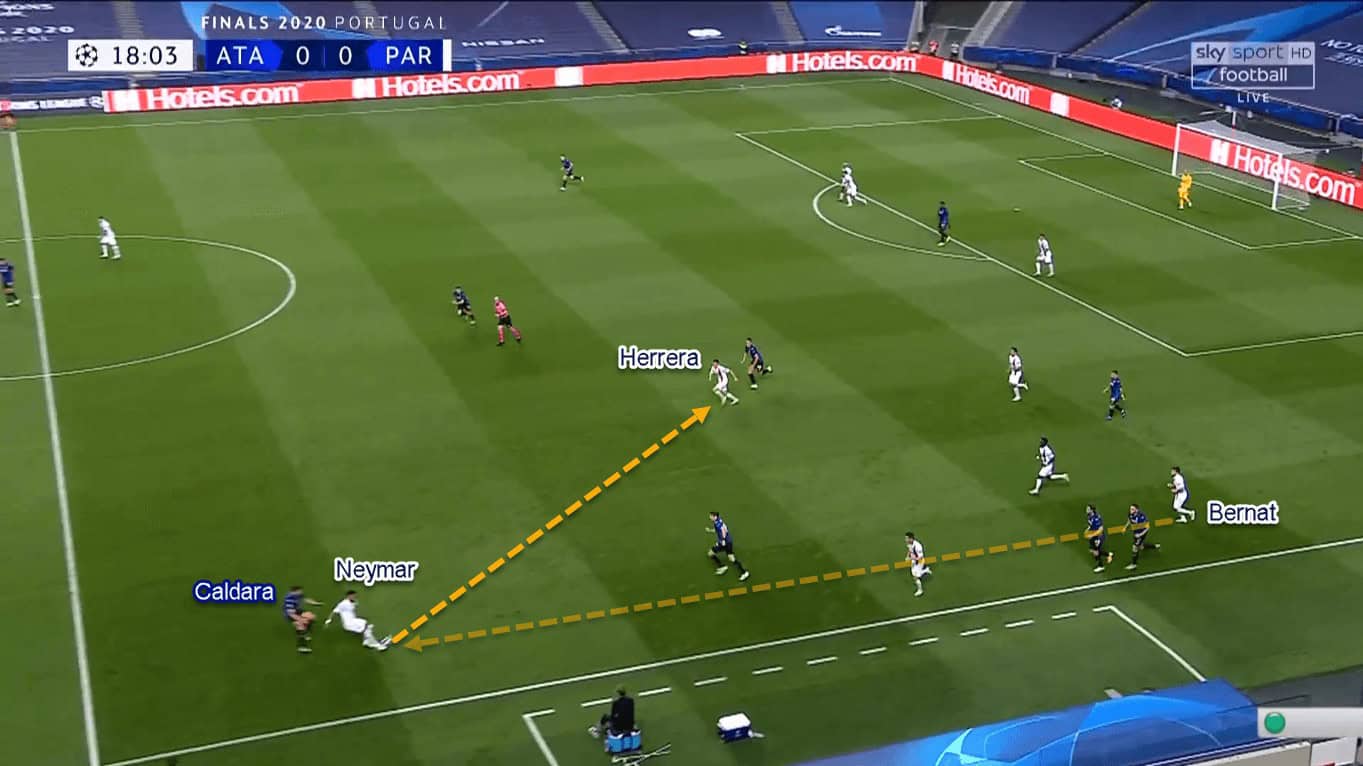 PSG tried to exploit this in various ways. First, Navas would try to send long balls to the forwards; mostly to Neymar. That’s because Neymar would drop in between the lines and pull Caldara with him. Sometimes he would also drift wide and takes Caldara further out of his position. The defenders could also be given the task to distribute the vertical passes at times.